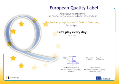 Συγχαρητήρια! Το σχολείο σας βραβεύθηκε με την Ευρωπαϊκή Ετικέτα Ποιότητας για την τελειότητα της εργασίας σας στο έργο eTwinning “Let’s play every day!”. Αυτό σημαίνει πως η εργασία σας, η εργασία των μαθητών και του σχολείου σας έχει αναγνωριστεί στο υψηλότερο Ευρωπαϊκό επίπεδο.