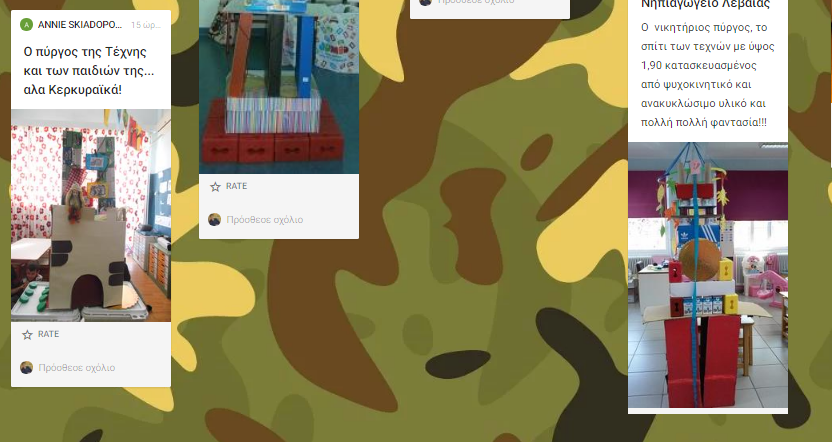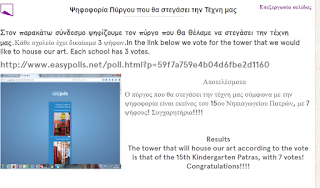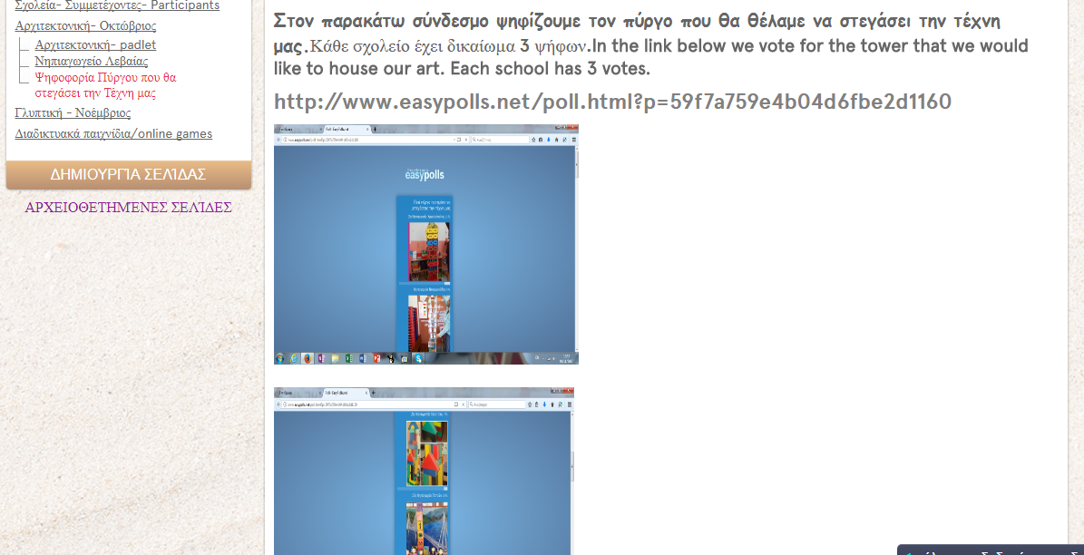 Έγινε γνωριμία μεταξύ των σχολείων και ήδη ξεκινήσαμε τον Οκτώβρη την ενασχόλησή μας με την Αρχιτεκτονική. Μιλήσαμε για την Αρχιτεκτονική και φτιάξαμε πύργους με υλικά που υπάρχουν στην τάξη μας. “Ανεβάζουμε” τις φωτογραφίες μας στη σελίδα του προγράμματος, βλέπουμε τους πύργους των άλλων σχολείων, τους σχολιάζουμε και θα γίνει ηλεκτρονική ψηφοφορία μεταξύ των κατασκευών.