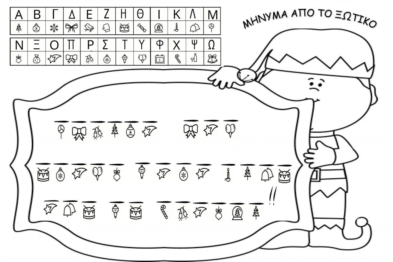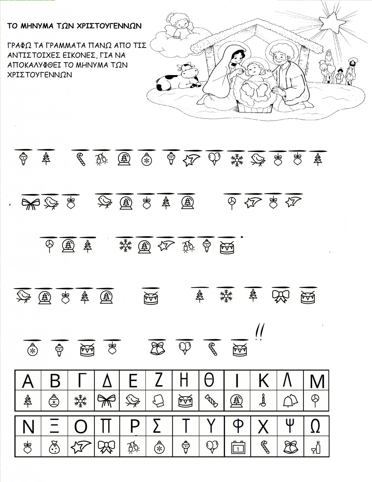 Ένα πολύ ωραίο φύλλο εργασίας, για να γράψουν τα παιδιά τα γράμματα και να αντιστοιχίσουν και τους αριμούς ή εικόνες είναι η αποκωδικοποίηση μηνυμάτων. Παρακάτω μπορούν τα παιδιά να αποκωδικοποιήσουν το μήνυμα των Χριστουγέννων.