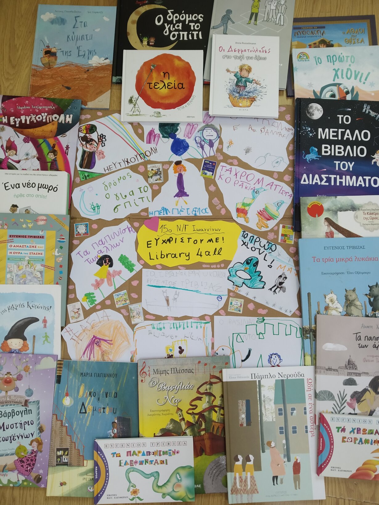 Όλοι οι μαθητές και οι εκπαιδευτικοί του νηπιαγωγείου μας είμαστε ενθουσιασμένοι με τη θετική ανταπόκριση τoυ μη κερδοσκοπικoύ οργανισμού Library4all στο αίτημά μας για δωρεά βιβλίων στο σχολείο μας. Η προσφορά τους συνδράμει την προσπάθειά μας να οργανώσουμε τη βιβλιοθήκη του νηπιαγωγείου σχεδόν εξ αρχής και να εμπλουτίσουμε με αξιόλογα βιβλία τη δανειστική βιβλιοθήκη.