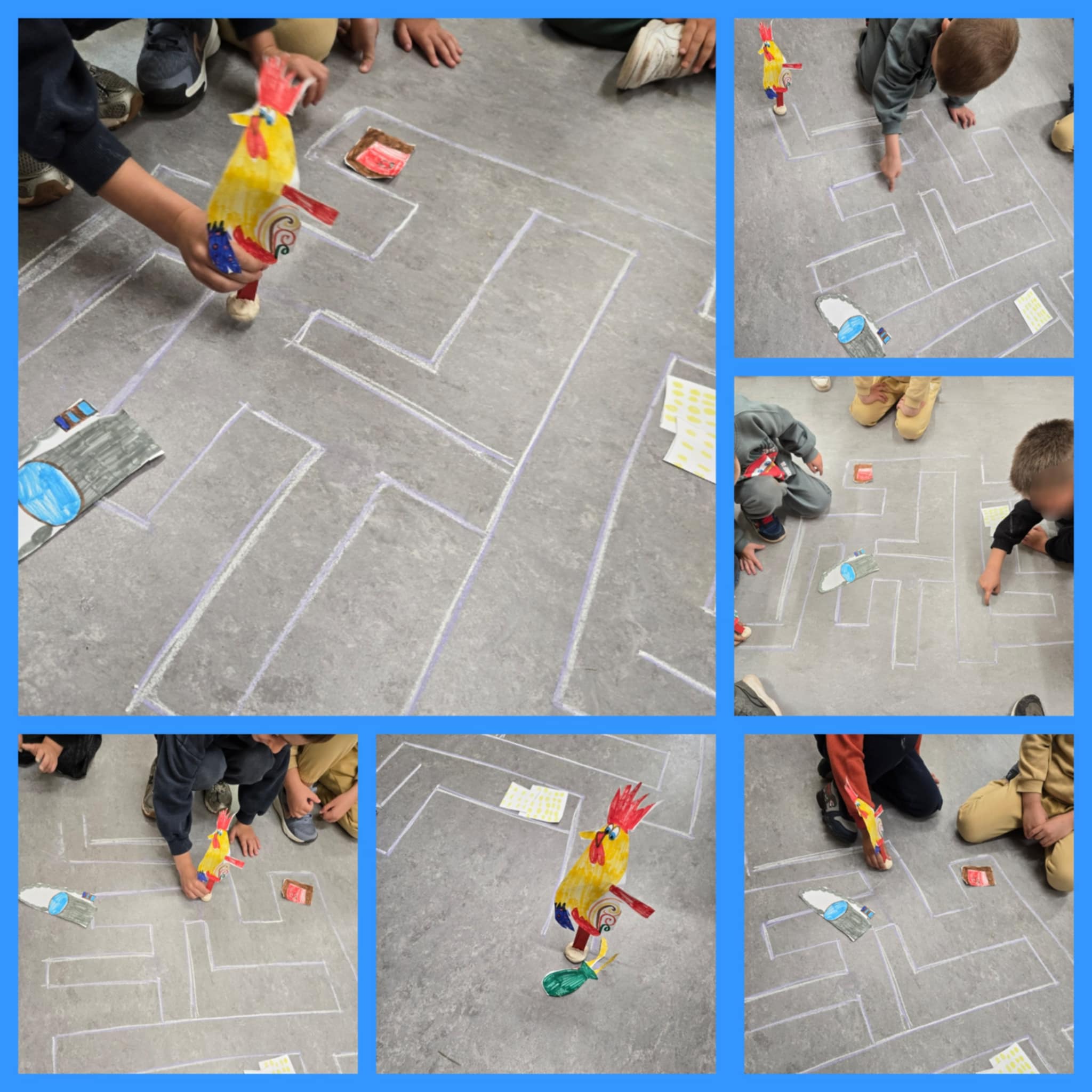 Διαβάσαμε το παραμύθι της Ρουμανίας και στη συνέχεια τα παιδιά ζωγράφισαν τον κύριο ήρωα, τον πετεινό, καθώς και τις σκηνές της ιστορίας. Ακολούθως, δημιούργησαν στο πάτωμα έναν λαβύρινθο, όπου ο πετεινός έπρεπε να ξεπεράσει διάφορα εμπόδια – το πηγάδι, τη φωτιά, τις αγελάδες και το θησαυροφυλάκιο – για να βρει το πουγγί με τα δύο φλουριά.
