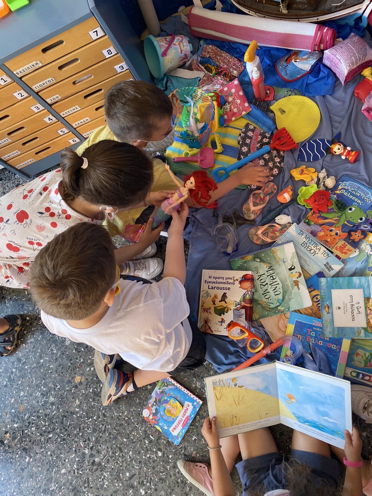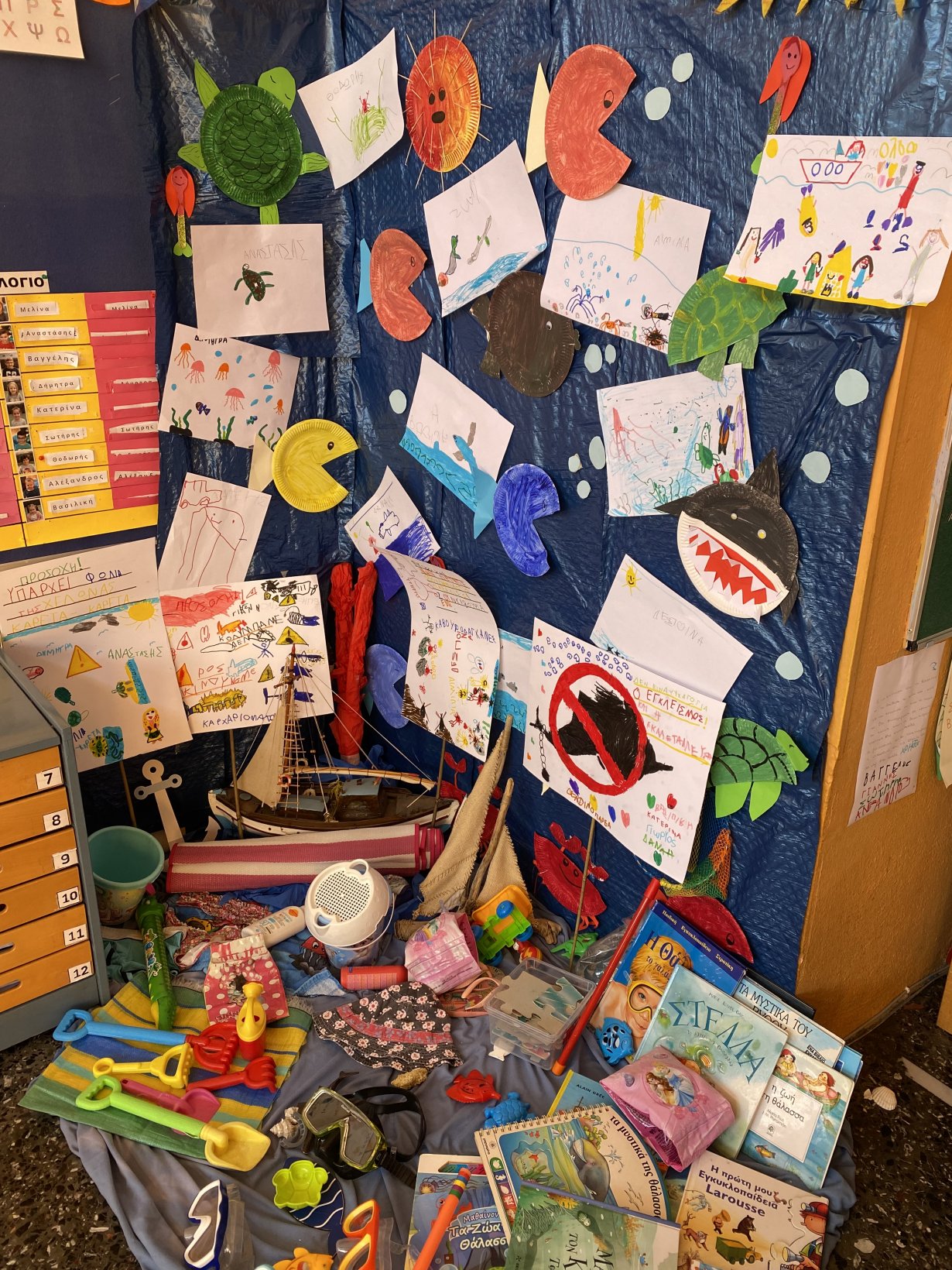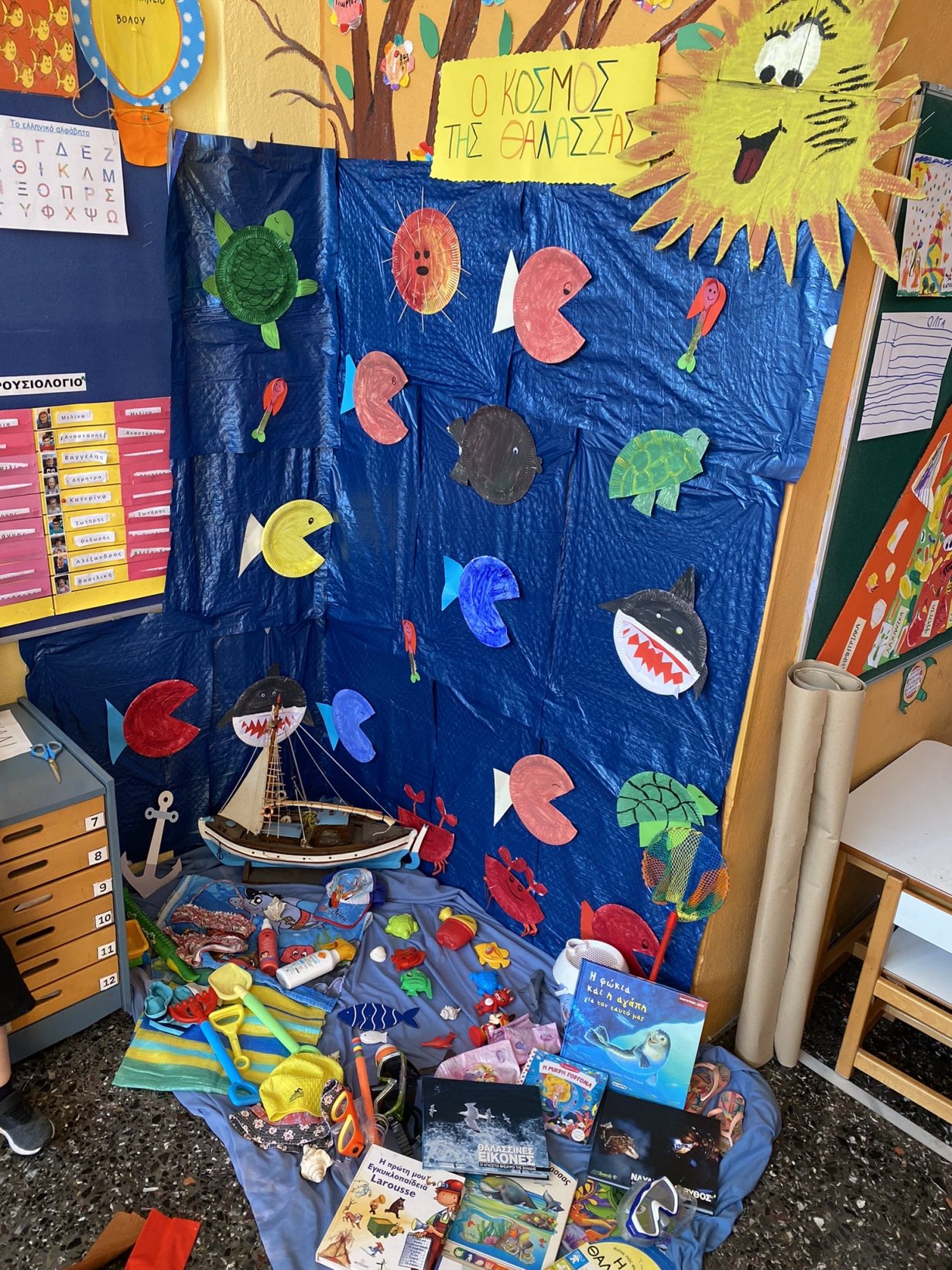 Το πρότζεκτ με το οποίο αποφάσισαν να ασχοληθούν οι φοιτήτριες τις 2 τελευταίες εβδομάδες της διδασκαλίας τους προέκυψε μέσα από τη συζήτηση και το ιστολόγιο που έφτιαξαν με τα παιδιά. Έτσι το θέμα τους αποφάσισαν να είναι ο “Κόσμος της Θάλασσας”. Οι φοιτήτριες ζήτησαν από το κάθε παιδί να φέρει από το σπίτι του ότι έχουν σε σχέση με τη θάλασσα (μαγιό, αντηλιακό, μπρατσάκια, κουβαδάκια κλπ.). Έτσι αφού έφεραν τα παιδιά τα πράγματά τους και μαζί με τις κατασκευές από τις φοιτήτριες φτιάξαμε τη γωνιά του κόσμου της θάλασσας, όπου τα παιδιά την αγάπησαν και δεν σταμάτησαν να παίζουν κάθε μέρα με τη συγκεκριμένη γωνιά.