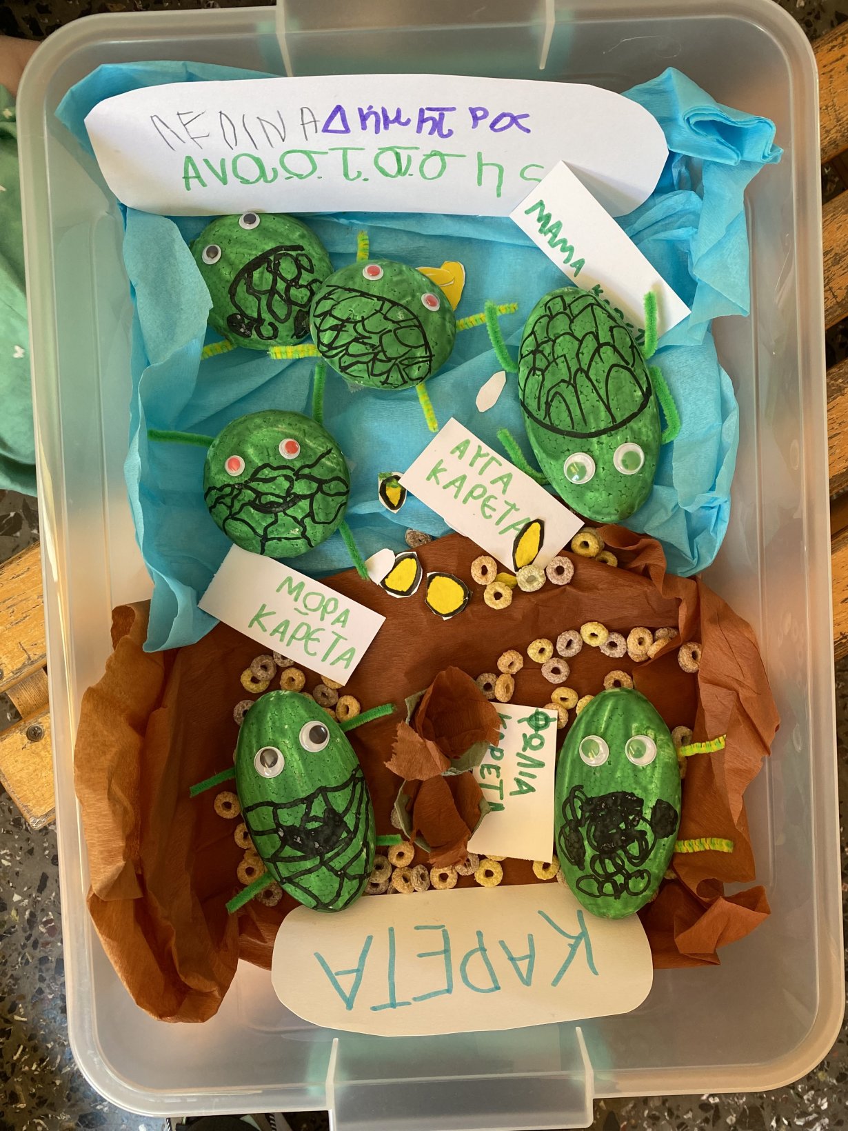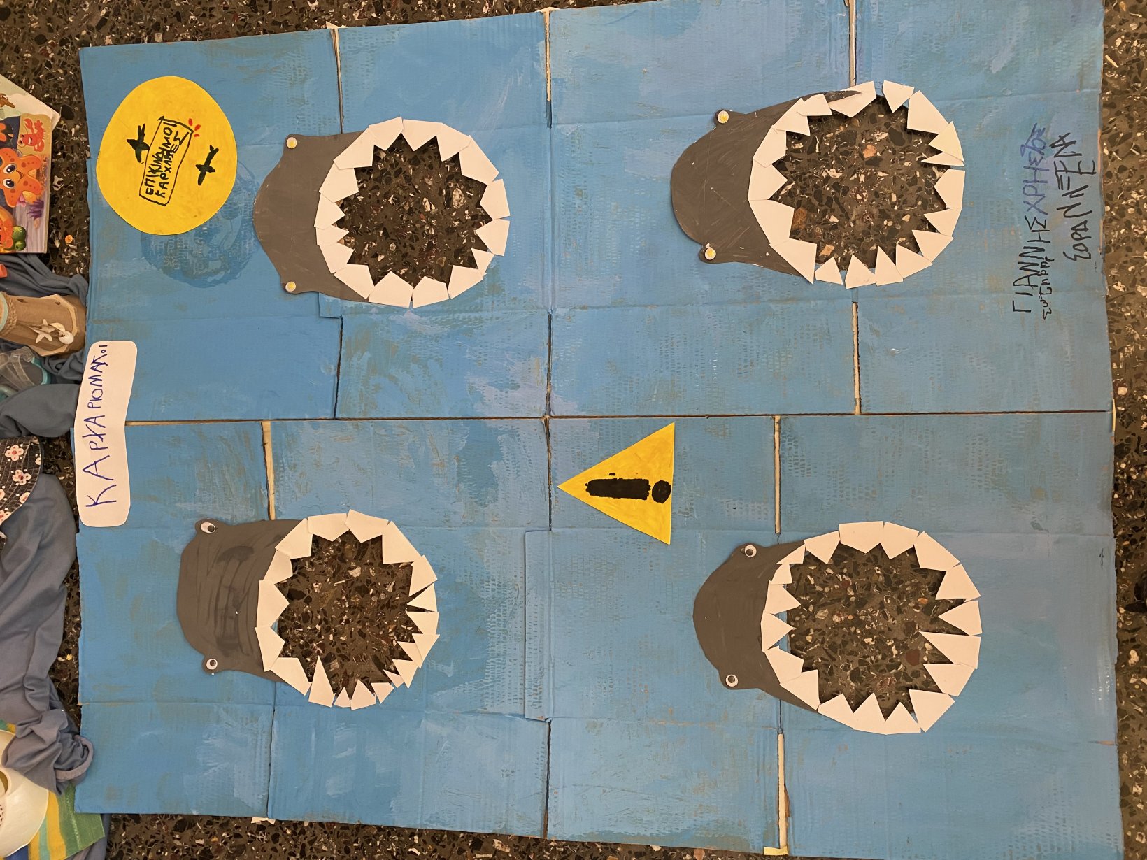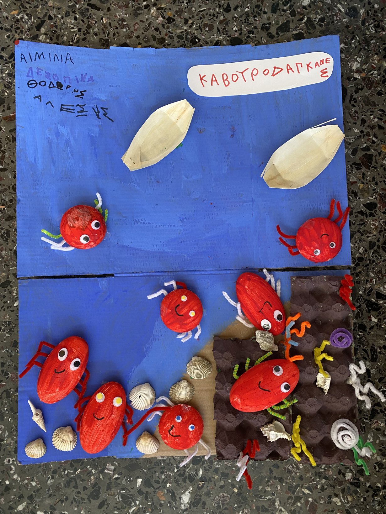 Στη συνέχεια δημιουργήθηκαν 4 ομάδες όπου η κάθε ομάδα είχε και ένα διαφορετικό όνομα για ένα ζώο της θάλασσας. Έτσι, οι ομάδες ‘ήταν οι εξής: οι καρχαριομάχοι, η δελφινοπαρέα, οι καβουροδαγκάνες και η χελώνα Καρέτα – Καρέτα. Έτσι, η κάθε ομάδα αφού έκανε τη σχετική έρευνα από τα βιβλία που τους δόθηκαν και έφτιαξε την αφίσα για το κάθε ζώο στη συνέχεια ξεκίνησαν με τη βοήθεια από τις φοιτήτριες να φτιάχνουν τις ομαδικές κατασκευές τους. Κατά τη διάρκεια του πρότζεκτ οι φοιτήτριες έπρεπε να προγραμματίσουν μια επίσκεψη ενός ανθρώπου που θα τους μιλήσει σχετικά με το θέμα τους. Έτσι, τα κορίτσια ζήτησαν από τον μπαμπά ενός παιδιού μας να έρθει να τους μιλήσει για τα ψάρια και το ψάρεμα και τους έδειξε και καλάμι ψαρέματος. Ο ενθουσιασμός των παιδιών ήταν απερίγραπτος.