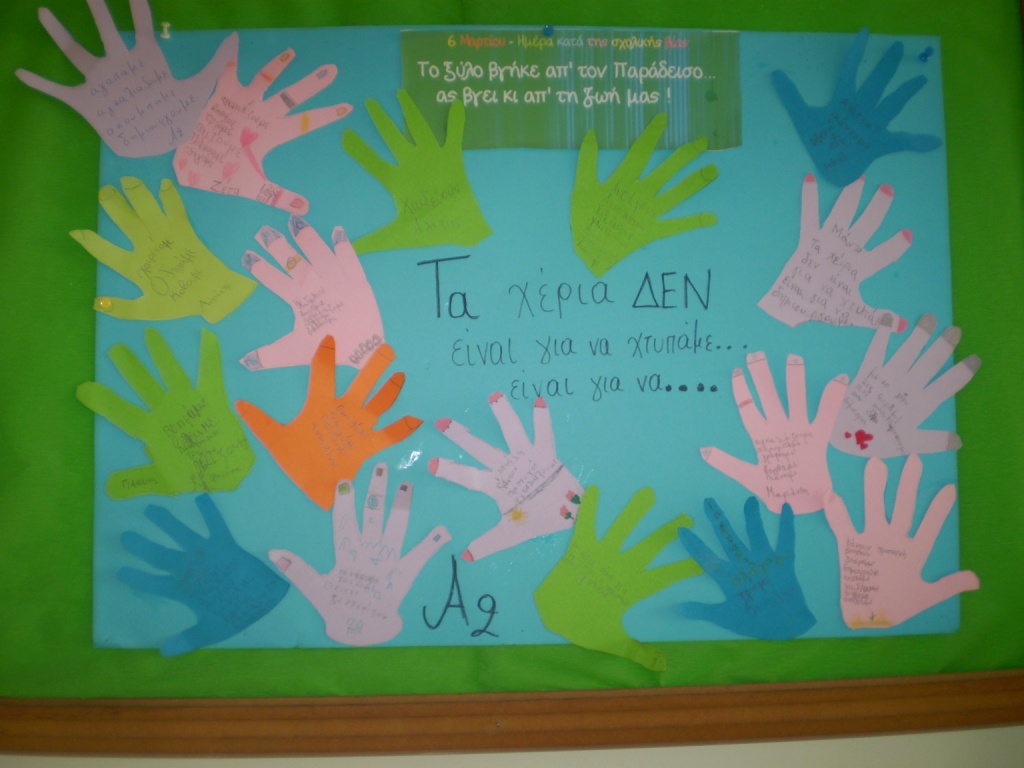 «Τα χέρια δεν είναι για να χτυπάμε αλλά για να…», αναφέρει η αφίσα που κατασκεύασαν οι μικροί μαθητές του περυσινού τμήματος Α2 και η οποία είναι αναρτημένη στον πίνακα ανακοινώσεων του σχολείου μας.