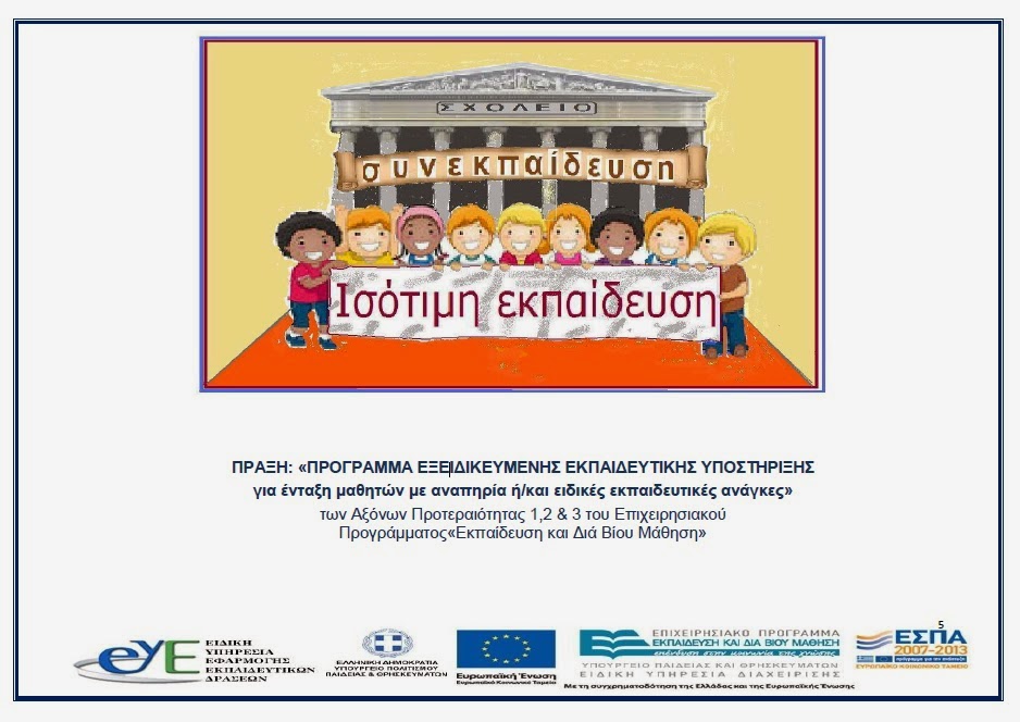 Οι Πράξεις «Πρόγραμμα εξειδικευμένης εκπαιδευτικής υποστήριξης για ένταξη μαθητών με αναπηρία ή/και ειδικές εκπαιδευτικές ανάγκες», των Αξόνων Προτεραιότητας 1, 2 και 3, (MIS 520707, 485613, 485614) του Επιχειρησιακού Προγράμματος «Εκπαίδευση και Δια Βίου Μάθηση» ως έργα υποψήφια για ένταξη στο ΕΠΑΝΑΔ του ΕΣΠΑ 2014-2020, που συγχρηματοδοτούνται από την Ευρωπαϊκή Ένωση (Ευρωπαϊκό Κοινωνικό Ταμείο) και από εθνικούς πόρους, αφορούν στην στήριξη και ενίσχυση του θεσμού της εξειδικευμένης εκπαιδευτικής υποστήριξης για ένταξη μαθητών με αναπηρία ή/και ειδικές εκπαιδευτικές ανάγκες για έξι σχολικά έτη (2010-2011, 2011-2012, 2012-2013, 2013-2014, 2014-2015 και 2015-2016). Το έργο υλοποιείται στο πλαίσιο των Αξόνων Προτεραιότητας 1, 2 και 3 (MIS 520707, 485613, 485614) «Αναβάθμιση της ποιότητας της εκπαίδευσης και προώθηση της κοινωνικής ενσωμάτωσης» στις 8 περιφέρειες Σύγκλισης, στις 3 περιφέρειες Σταδιακής Εξόδου και στις 2 περιφέρειες Σταδιακής Εισόδου, αντίστοιχα.