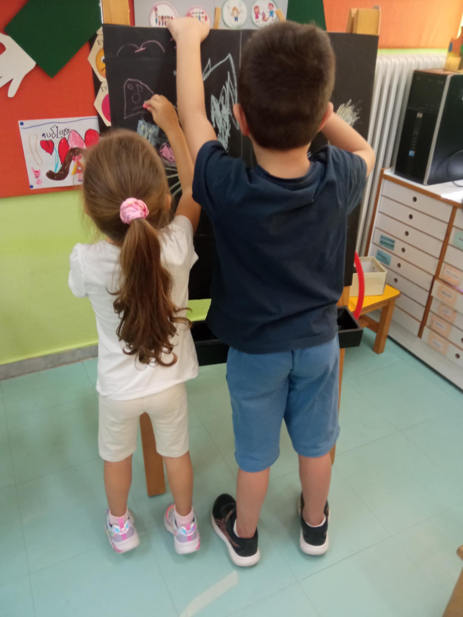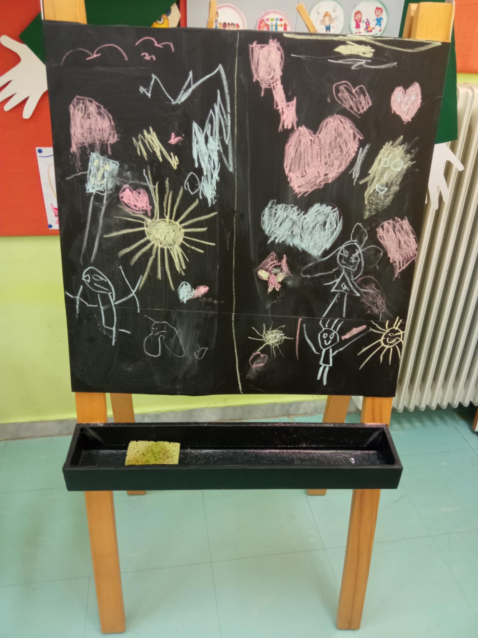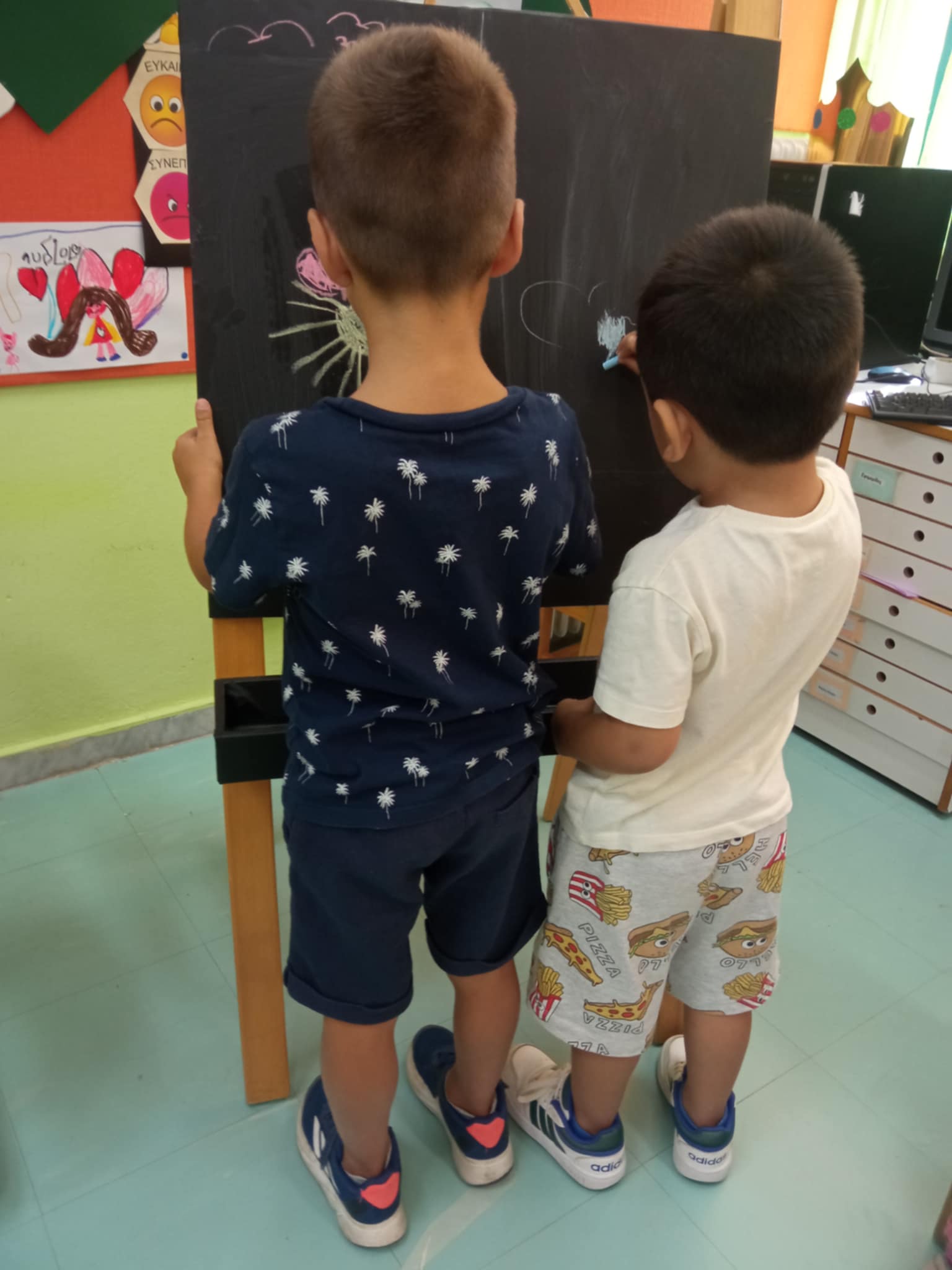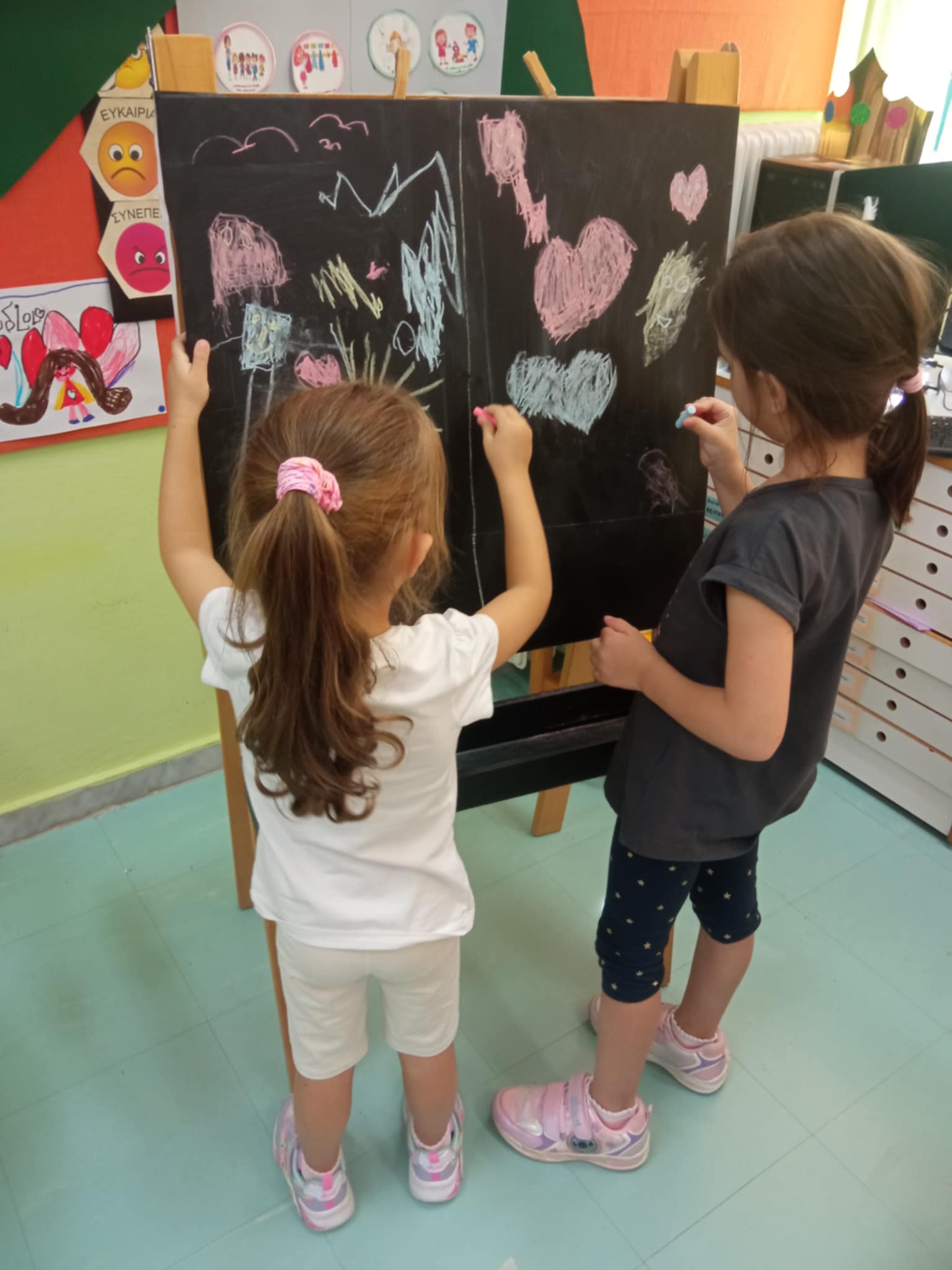 Τα παιδιά στο νηπιαγωγείο έχουν την ιδιαίτερη χαρά να εμπλέκονται καθημερινά σε μία μεγάλη ποικιλία υλικών, δραστηριοτήτων και εμπειριών. Αυτό έχει σαν συνέπεια να κεντρίζεται πάντα το ενδιαφέρον τους, να ανακαλύπτουν καινούρια πράγματα, να δημιουργούν μία θετική διάθεση για το σχολείο και τελικά να μαθαίνουν εύκολα και αποτελεσματικά μέσα από το παιχνίδι. Έτσι λοιπόν τα παιδιά σήμερα ήρθαν σε μία πρώτη επαφή με την ζωγραφική με κιμωλίες στον μαυροπίνακα της τάξης μας και προσπάθησαν ομαδικά να αποτυπώσουν την φαντασία τους. Μάθαμε να σεβόμαστε το έργο του άλλου, να μοιραζόμαστε όλοι μαζί τον ίδιο χώρο και φυσικά να μην ασκούμε αρνητική κριτική για την αυτοέκφραση του διπλανού μας. Τα έργα μας στην διάθεσή σας!