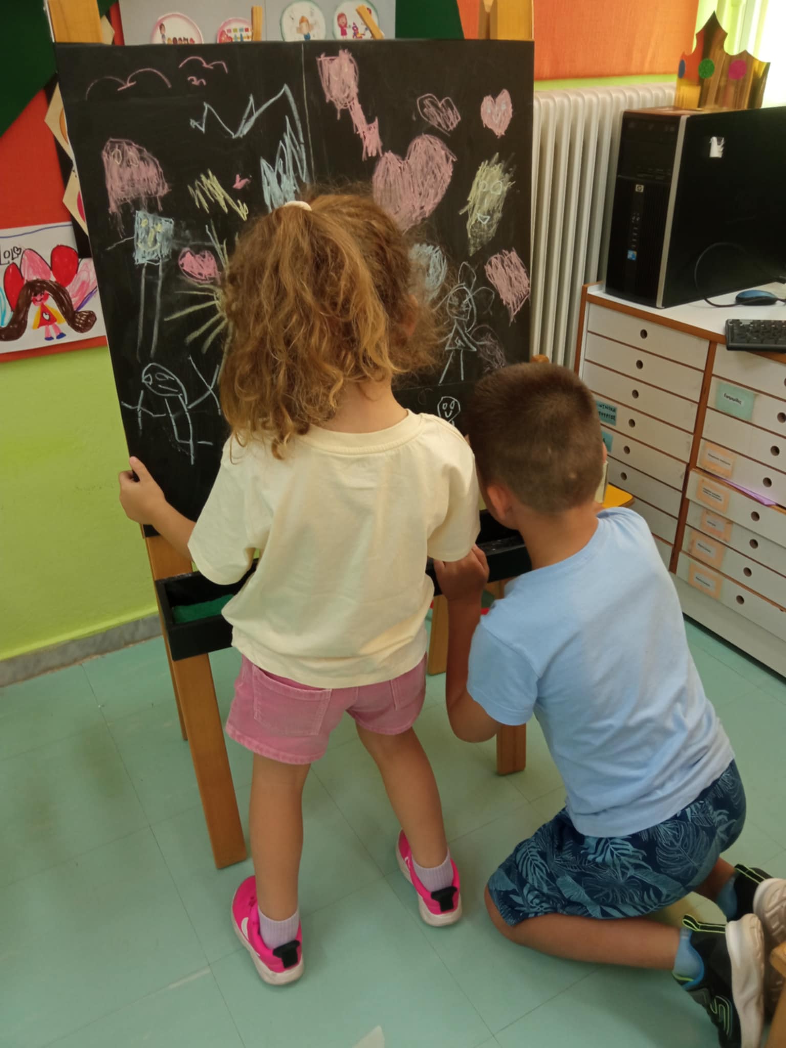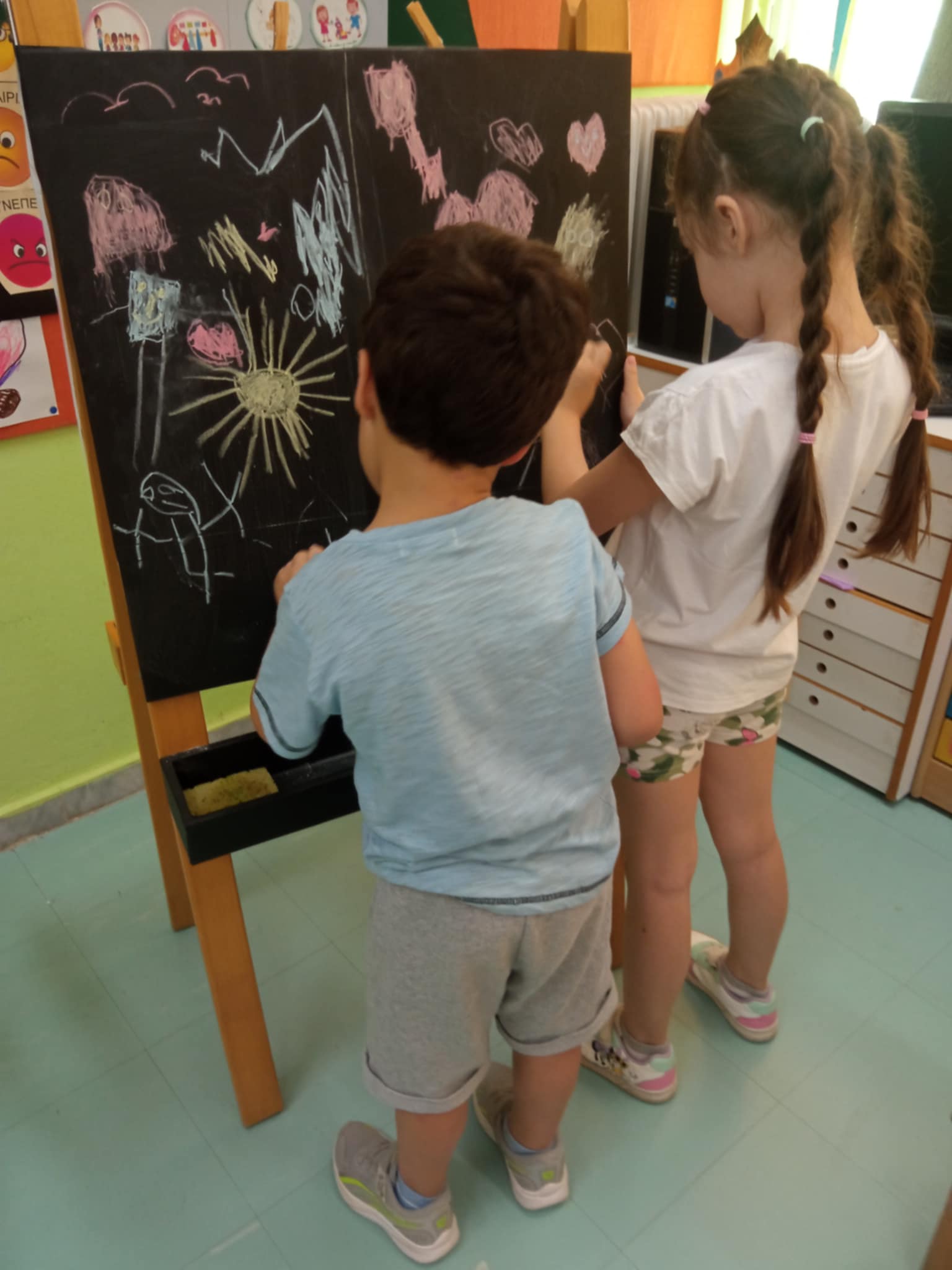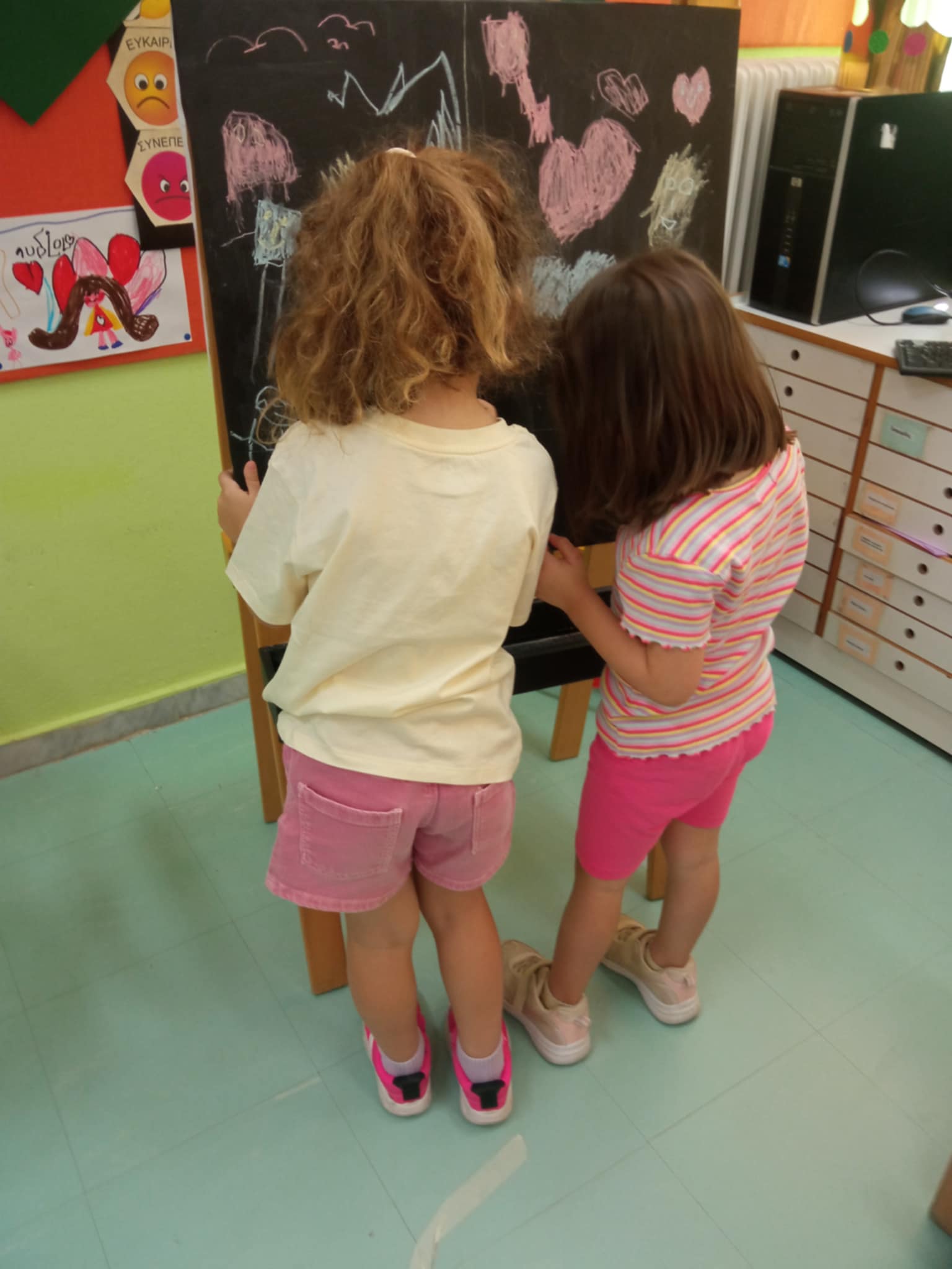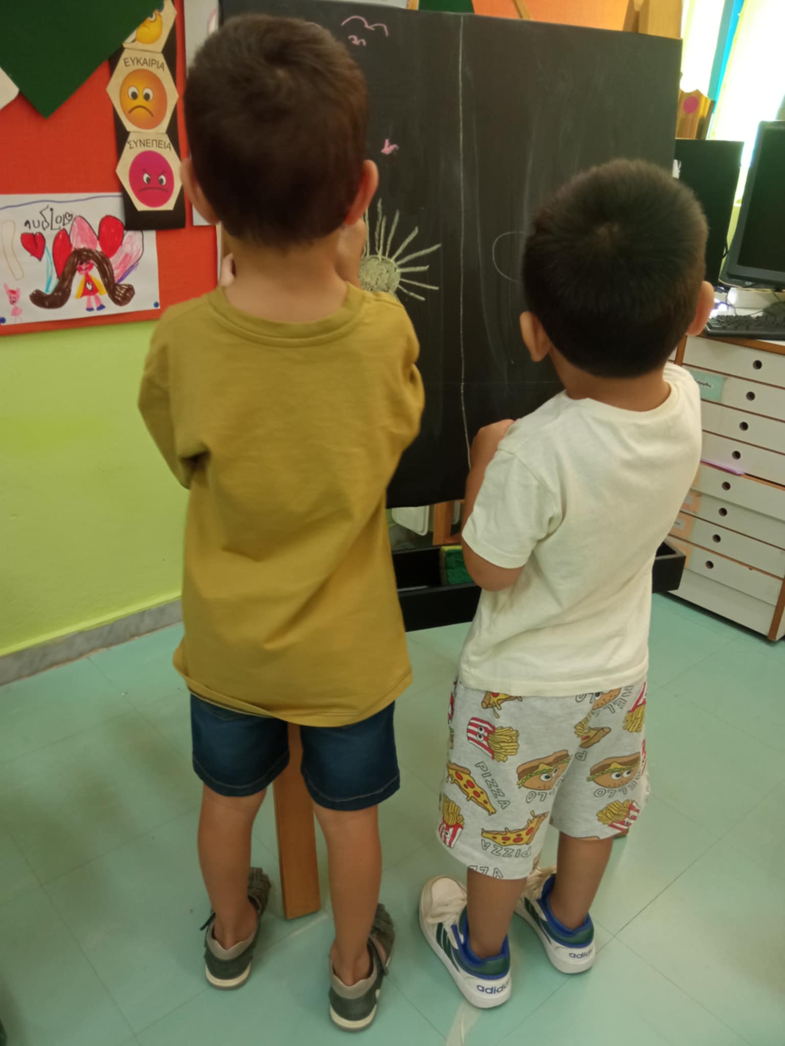 Τα παιδιά στο νηπιαγωγείο έχουν την ιδιαίτερη χαρά να εμπλέκονται καθημερινά σε μία μεγάλη ποικιλία υλικών, δραστηριοτήτων και εμπειριών. Αυτό έχει σαν συνέπεια να κεντρίζεται πάντα το ενδιαφέρον τους, να ανακαλύπτουν καινούρια πράγματα, να δημιουργούν μία θετική διάθεση για το σχολείο και τελικά να μαθαίνουν εύκολα και αποτελεσματικά μέσα από το παιχνίδι. Έτσι λοιπόν τα παιδιά σήμερα ήρθαν σε μία πρώτη επαφή με την ζωγραφική με κιμωλίες στον μαυροπίνακα της τάξης μας και προσπάθησαν ομαδικά να αποτυπώσουν την φαντασία τους. Μάθαμε να σεβόμαστε το έργο του άλλου, να μοιραζόμαστε όλοι μαζί τον ίδιο χώρο και φυσικά να μην ασκούμε αρνητική κριτική για την αυτοέκφραση του διπλανού μας. Τα έργα μας στην διάθεσή σας!