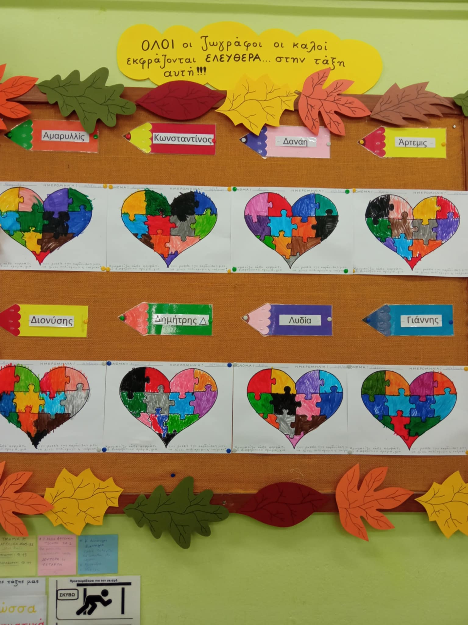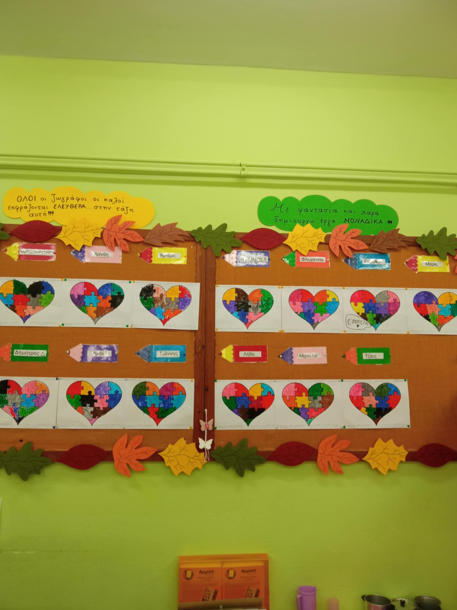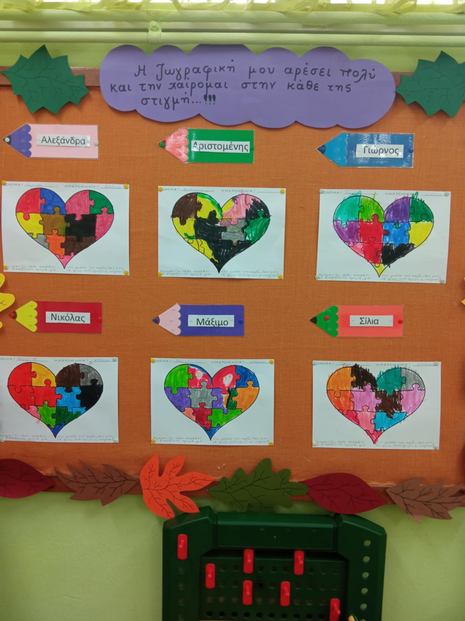 Μία από τις πιο ευχάριστες στιγμές για τα παιδιά στο νηπιαγωγείο, είναι σίγουρα η καλλιτεχνική τους έκφραση και δημιουργία . Μέσα από την ζωγραφική αποτυπώνουν τις σκέψεις τους ,τα συναισθήματά τους, την αντιληπτική τους ικανότητα και την διάθεσή τους να αποδώσουν με τον δικό τους μοναδικό τρόπο, όσα εκπαιδευτικά ερεθίσματα έχουν δεχτεί. Η πρώτη μας προσπάθεια να αναγνωρίσουμε τα βασικά και τα συμπληρωματικά ΧΡΩΜΑΤΑ , εκφράστηκε σε μία πολύ τρυφερή, πολύχρωμη καρδούλα puzzle , στην οποία χρησιμοποιήσαμε από μια φορά τους μαρκαδόρους της κασετίνας μας, προσέχοντας να μην συμπέσουν ίδια χρώματα το ένα δίπλα στο άλλο. Νομίζουμε ότι ήταν πραγματικά μια πολύ καλή προσπάθεια!