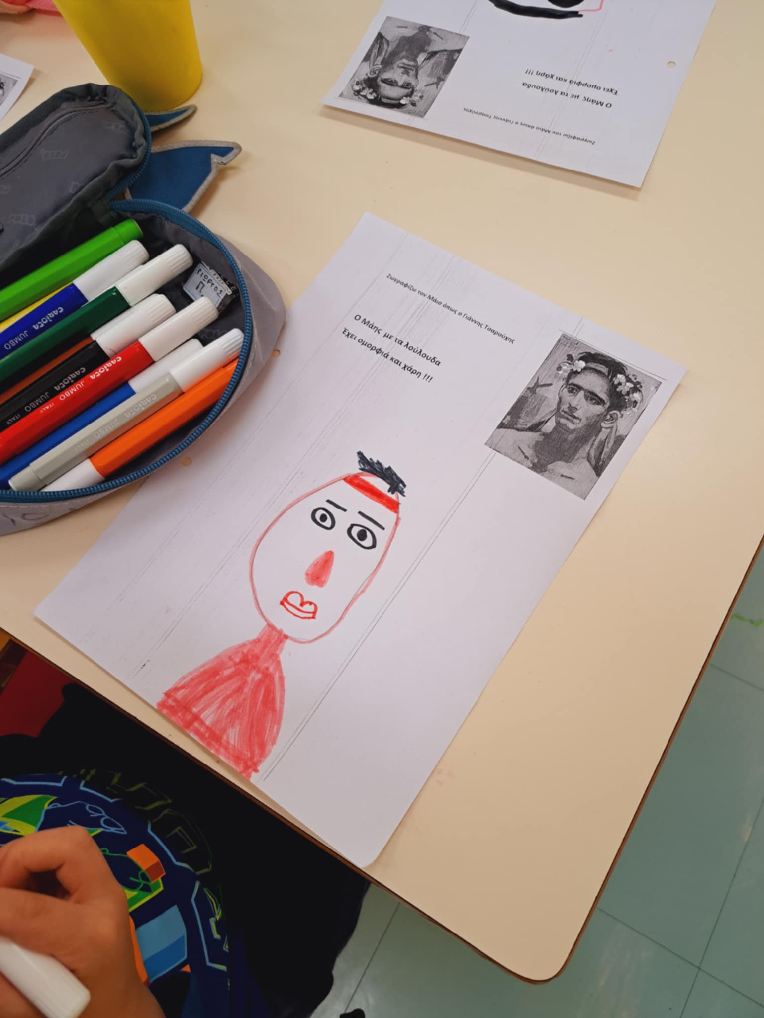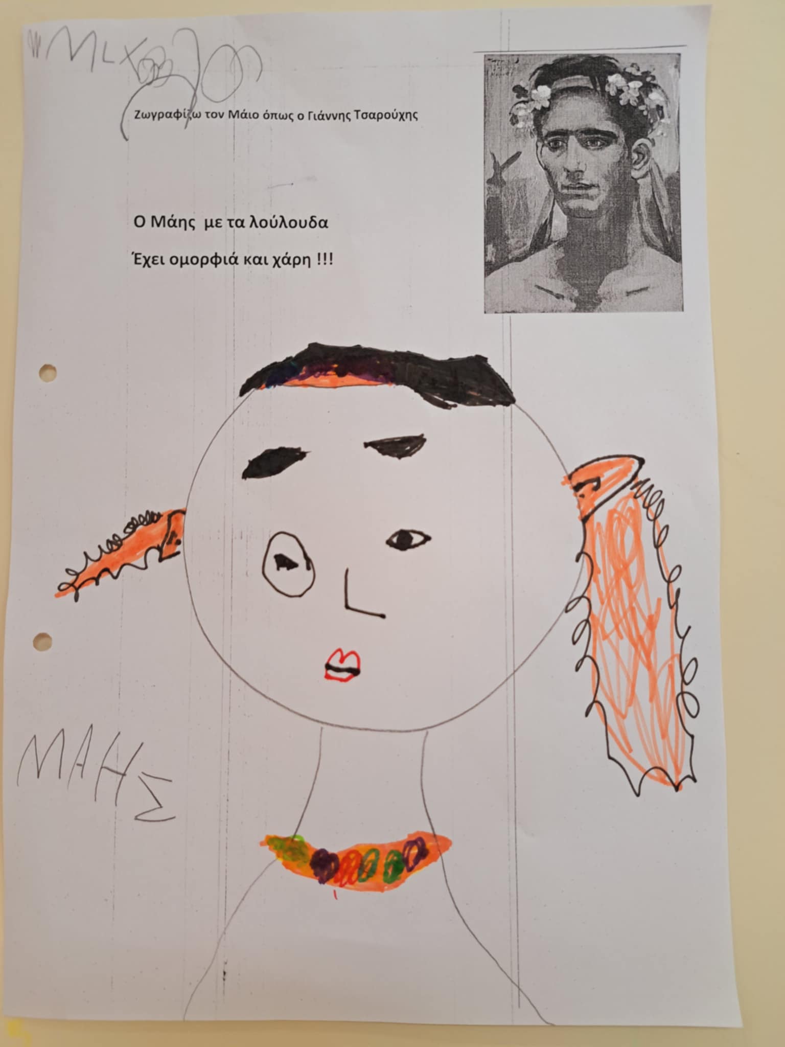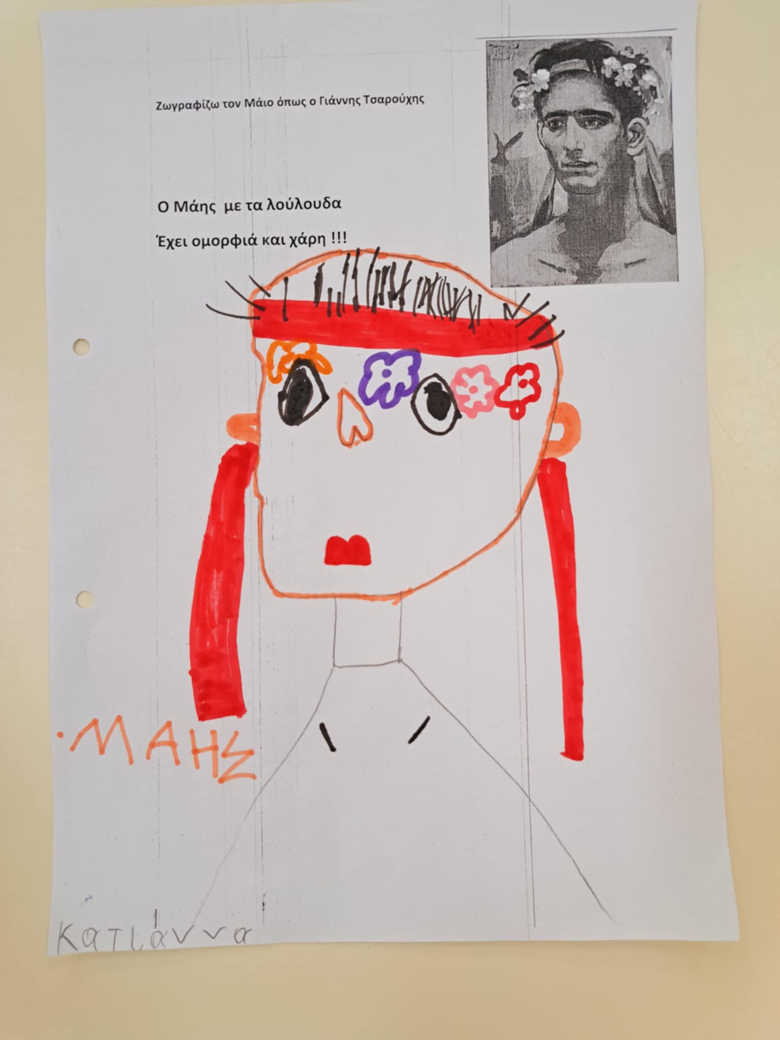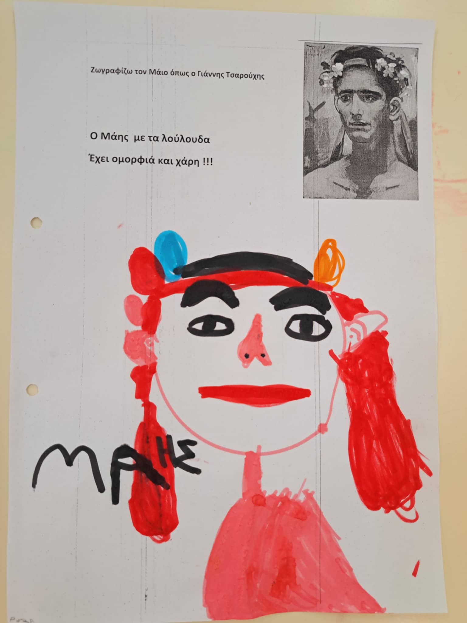 Μιλήσαμε για τον τρίτο λοιπόν μήνα της Άνοιξης ,τις ονομασίες του ,τα φρούτα και τις καιρικές συνθήκες που τον χαρακτηρίζουν και φυσικά και για το έθιμο του στεφανιού ..Παρατηρήσαμε το στεφάνι που φέραμε και φωτογραφηθήκαμε στην αυλή μας ,ενώ με το ολοήμερο περιεργαστήκαμε τον πίνακα του Τσαρούχη και ζωγραφήσαμε τον δικό μας πίνακα με τον Μάη.