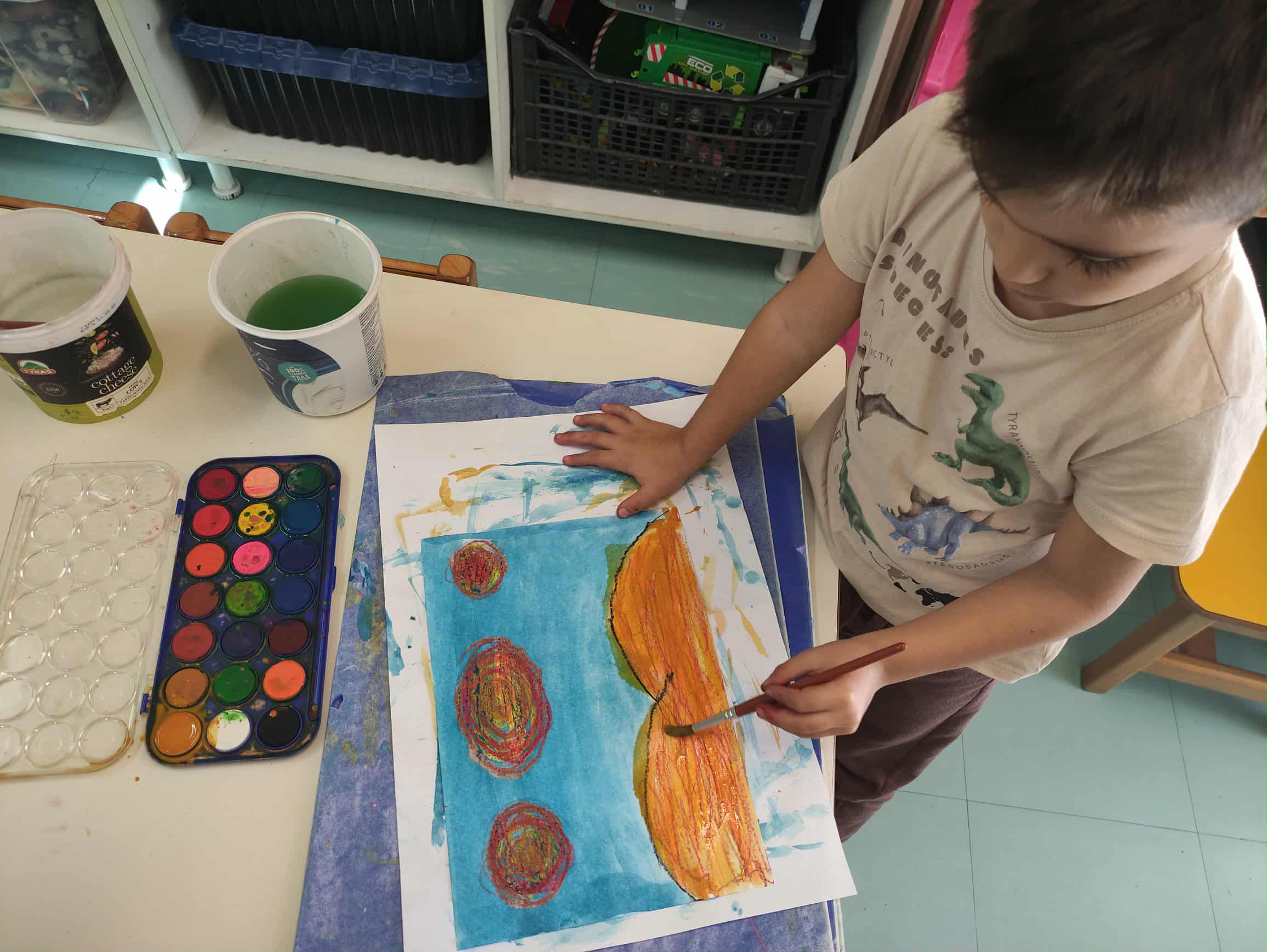 Λουλούδια σε καδράκια με τέμπερες τύπωμα, θήκες cup cake για λουλούδια και μαρκαδόρους για φύλλα και μίσχους. Λεπτομέρεια τα καδράκια είναι από δίσκους λαχανικών και τα παιδιά μαθαίνουν να ανακυκλώνουν τα υλικά των οικιακών συσκευασιών ώστε να δημιουργούν έργα τέχνης: