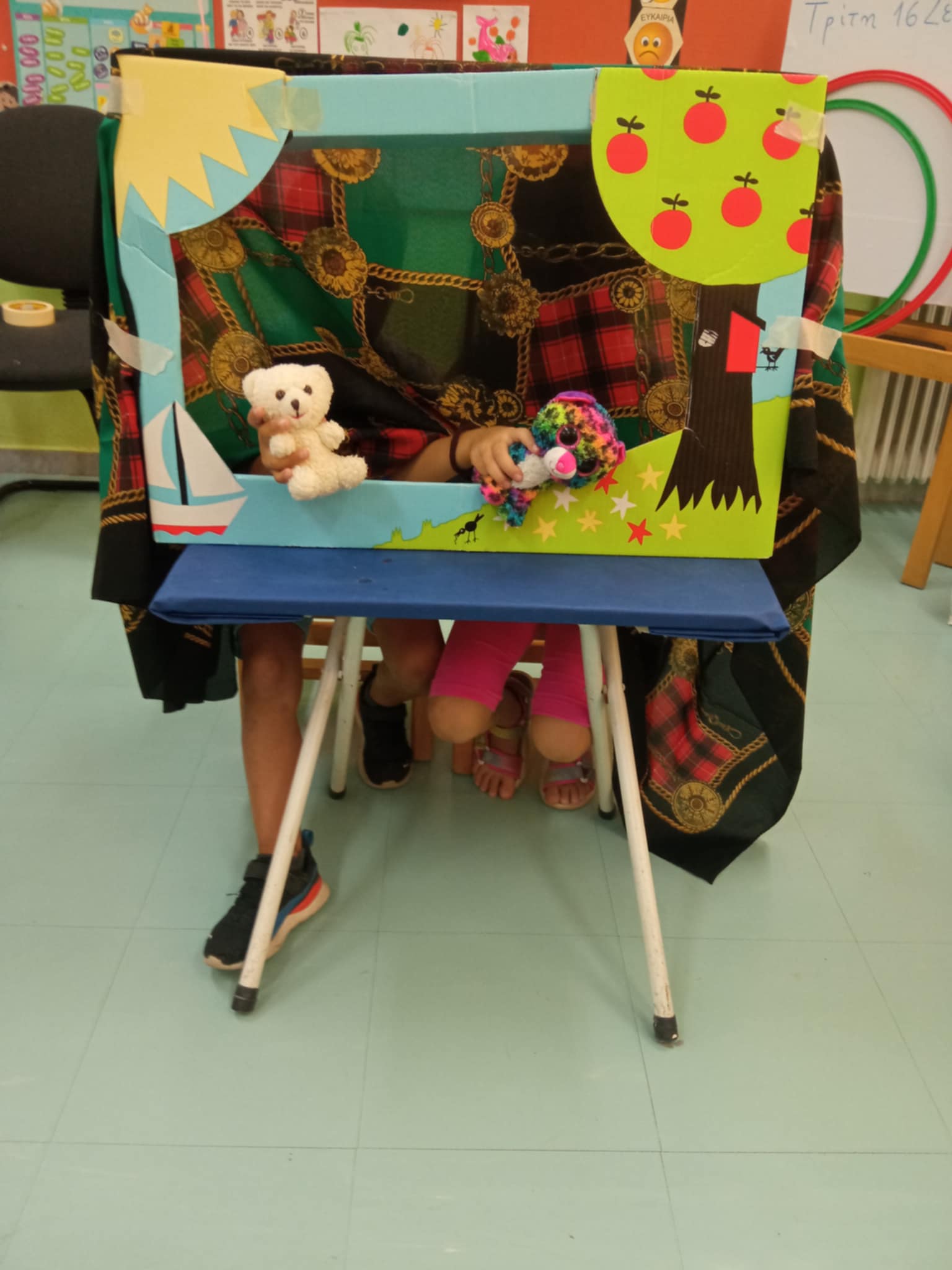 Μία πάρα πολύ ωραία δραστηριότητα που πραγματοποιήθηκε τις πρώτες ημέρες στην τάξη μας αξιοποιώντας δημιουργικά τα λούτρινα ζωάκια του νηπιαγωγείου μας ήταν το κουκλοθέατρο. Τα παιδιά την δέχτηκαν με μεγάλο ενθουσιασμό και χαρά σε τέτοιο βαθμό μάλιστα, που περιμένουν πώς και πώς την επόμενη φορά. Χρησιμοποιήσαμε ένα αυτοσχέδιο σκηνικό, μία υποτυπώδη αυλαία ( ένα πολύχρωμο μαντήλι ) , χωρίστηκαν τα παιδιά σε ζευγαράκια παρουσίασης, διάλεξαν τα ζωάκια που τους άρεσαν περισσότερο και βίωσαν , πώς είναι ο ρόλος του κουκλοπαίκτη ή της κουκλοπαίκτριας. Ακούστηκαν υπέροχες ιστορίες, και οι μικροί μας μαθητές ομαλά και αβίαστα εξέφρασαν σκέψεις, συναισθήματα, φοβίες, ιδέες και προσωπικές αντιλήψεις για την πλοκή του έργου. Έτσι η δυαδική σχέση έγινε δίαυλος αλληλογνωριμίας μεταξύ μας, φιλίας, κοινωνικής ένταξης και αποδοχής.