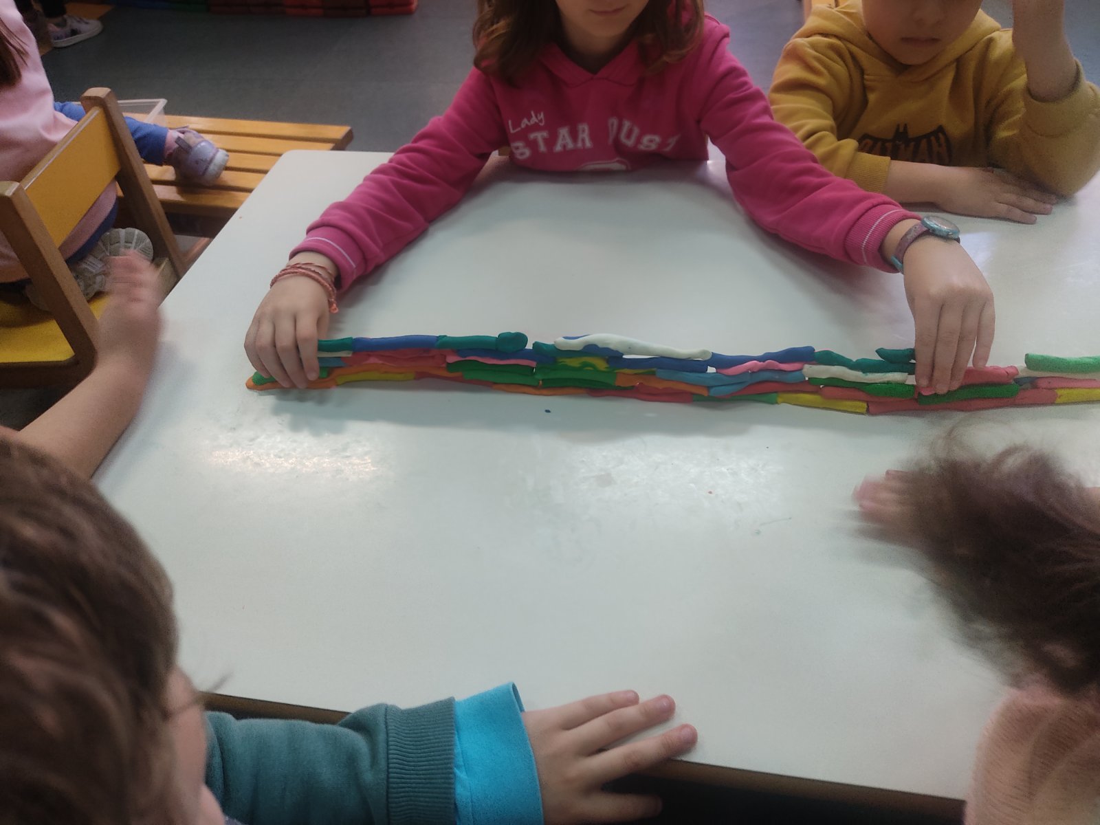 ” Το τείχος”.. το διαβάσαμε, μιλήσαμε για αυτό και σε ομάδες τα παιδιά έφτιαξαν τα δικά τους τείχη. Τους άρεσαν τα τείχη που τα χώρισαν; Η απάντηση ήρθε όταν αποφάσισαν να τα γκρεμίσουν.. και το έκαναν με πολύ χαρά! Στο τέλος φτιάξαμε την πολύχρωμη χώρα ..