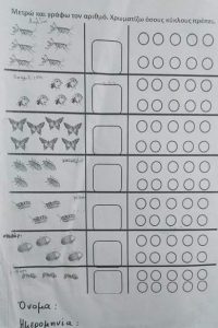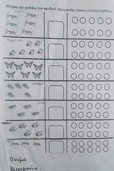 Με την άσκηση αυτή επεξεργαζόμαστε την αντιστοίχιση και τους αριθμούς και αναπτύσσουμε την παρατηρητικότητα και τη συγκέντρωση των παιδιών. Επίσης, μαθαίνουμε τις ονομασίες πολλών εντόμων. Τέλος, ας ακούσουμε και ας θυμηθούμε το τραγούδι “Μια ωραία πεταλούδα”. https://www.youtube.com/watch?v=4WQIvJIp4r8