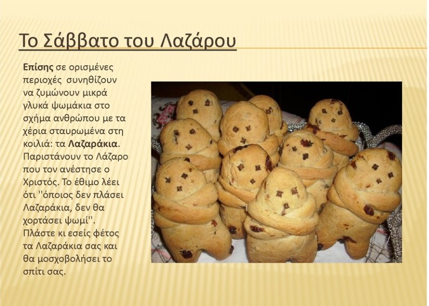 Καλημέρα σε μικρούς και μεγάλους!! Πλησιάζει το Σάββατο του Λαζάρου!!! Η Ανάσταση του Λάζαρου ,συμβολίζει τη Νίκη του Χριστού απέναντι στο θάνατο. Την παραμονή της γιορτής του Λαζάρου ή σε πολλά μέρη ανήμερα, τα παιδιά, κρατώντας το “Λάζαρο” ένα ομοίωμα του Λάζαρου γύριζαν από σπίτι σε σπίτι και τραγουδούσαν τα “Λαζαράκια”, για να διηγηθούν την ιστορία του αναστημένου φίλου του Χριστού και να μαζέψουν αυγά για το Πάσχα. Μαζί με το Λαζαρο κρατούσαν κι ένα μικρό καλαθάκι, που το είχαν στολίσει με διάφορα αγριολούλουδα . Πήγαιναν σε πολλά σπίτια μέχρι να γεμίσουν το καλαθάκι με αβγά για να τα βάψουν κόκκινα το Πάσχα.