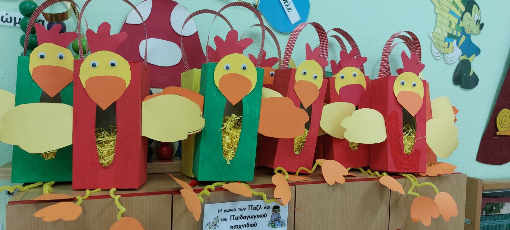 Οι κάρτες και τα καλαθάκια μας! Τα αυγά της κάρτας είναι βαμμένο χαρτί με νερομπογιά από τα παιδιά και μετά κόψιμο σε σχήμα αυγού.