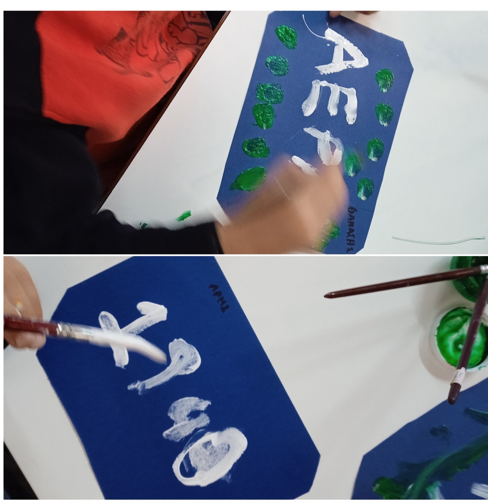 Ο χώρος είχε στολιστεί με συνεργατικές εικαστικές δημιουργίες των παιδιών σχετικά με τον πόλεμο και την ειρήνη και με σημαιούλες .