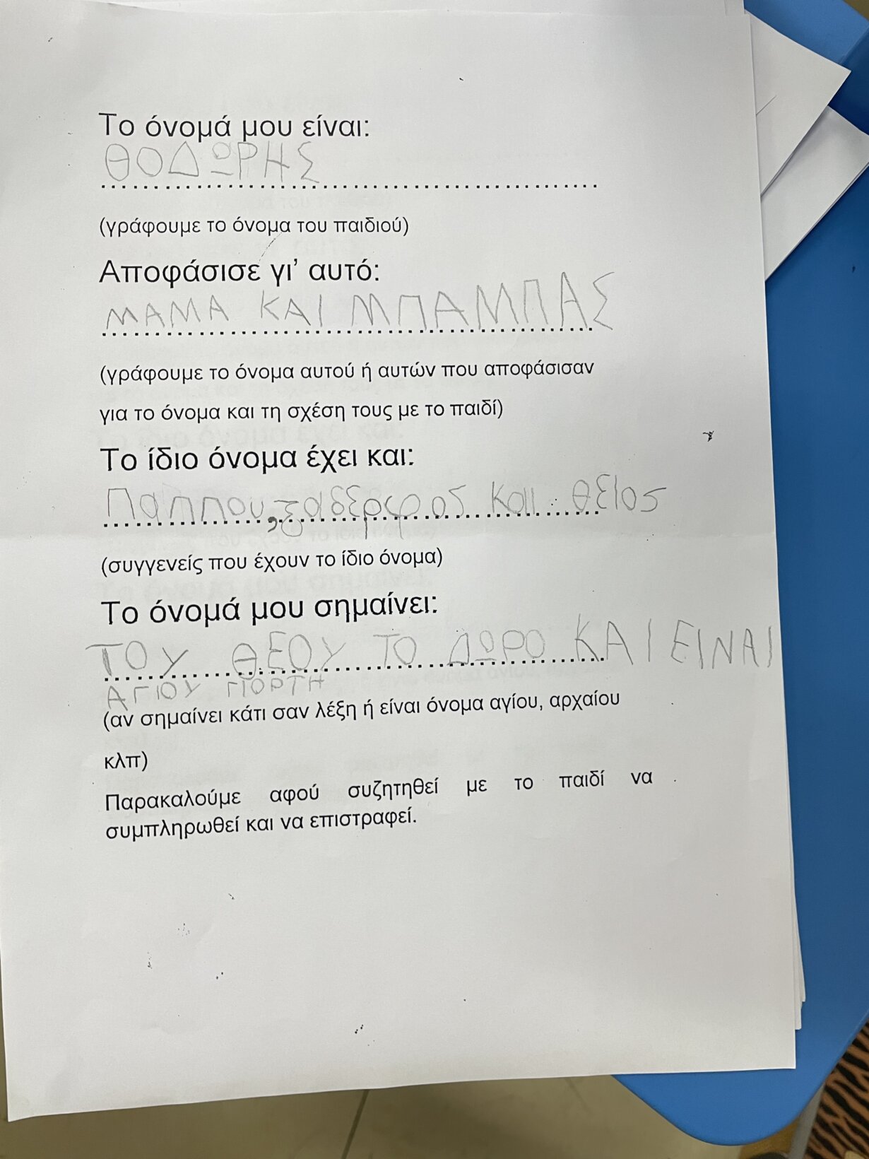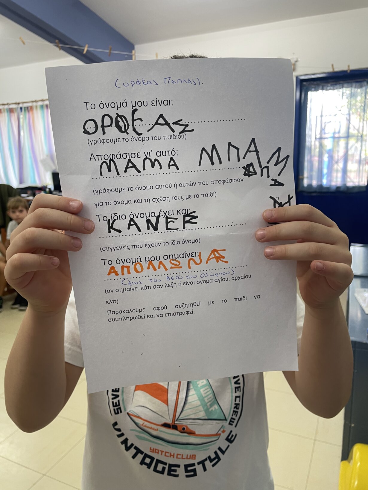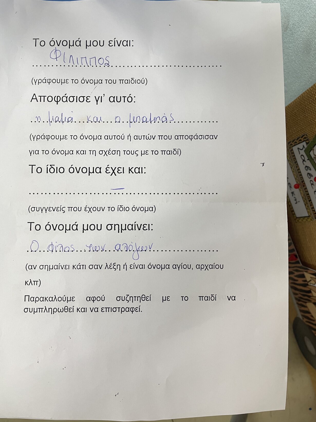 Τα παιδιά ρώτησαν τους γονείς τους και ήρθαν στο νηπιαγωγείο έτοιμα να παρουσιάσουν το όνομα τους και την ιστορία που κρύβεται πίσω από αυτό.