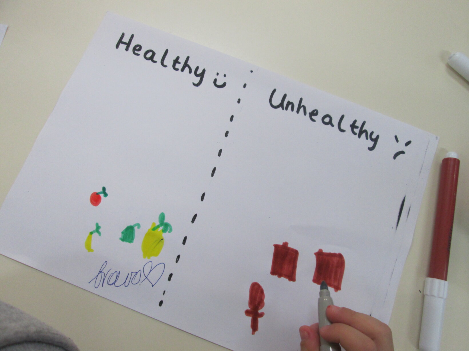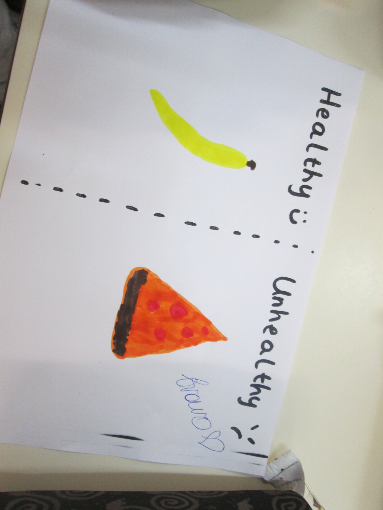 Τα παιδιά με την Miss Amy μίλησαν για τα healthy and unhealthy food and drinks. Είπαν τι τους αρέσει να τρώνε και τι απεχθάνονται και στη συνέχεια ζωγράφισαν και τραγούδησαν τα αγαπημένα τους, Διάβασαν την ιστορία της πεινασμένης κάμπιας “The very hungry caterpillar” και χόρεψαν το “food freeze dance”.