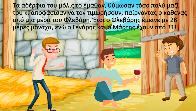 Με αφορμή αυτό διαβάσαμε “Τον μύθο του Φλεβάρη” που ήπιε όλο το κρασί από το βαρέλι και τα αδέρφια του ο Ιανουάριος και ο Μάρτιος του πήραν από μια ημέρα.