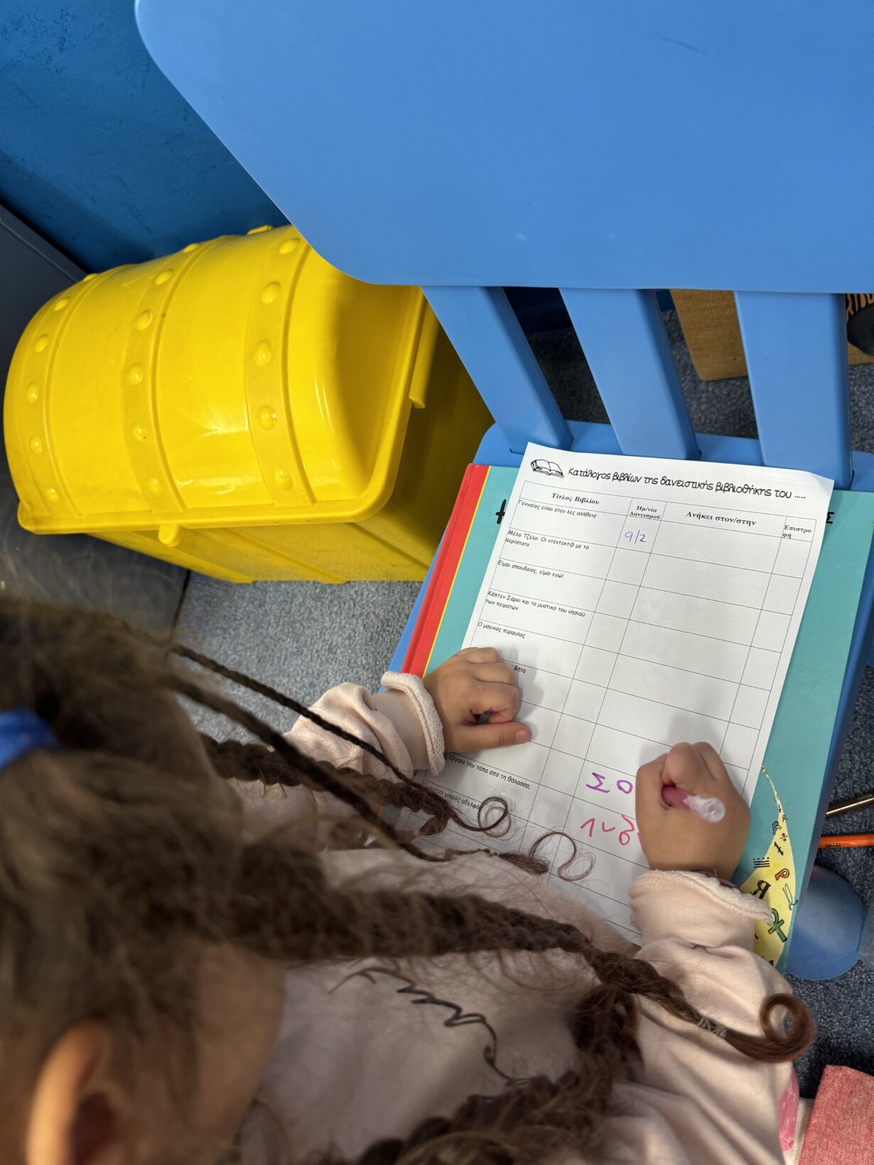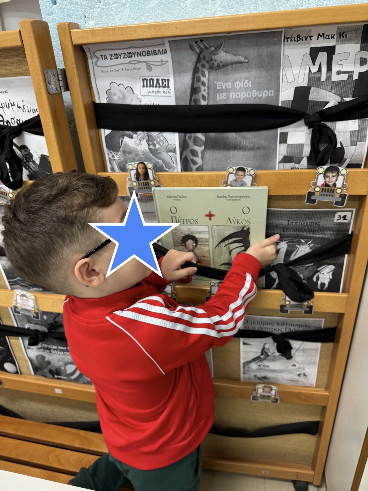 Έτσι τα παιδιά διάλεξαν το βιβλίο που τους άρεσε, πήραν το καρτελάκι δανεισμού τους και το κόλλησαν στην αντίστοιχη θέση στη βιβλιοθήκη. Δεν ξέχασαν να γράψουν στο φύλλο δανεισμού το όνομα τους!!! Τέλος μαζί με το βιβλίο τους πήραν και το αντίστοιχο φύλλο εργασίας, το οποίο θα επιστρέφαν στο σχολείο μαζί με το βιβλίο στην αρχή της επόμενης εβδομάδας.