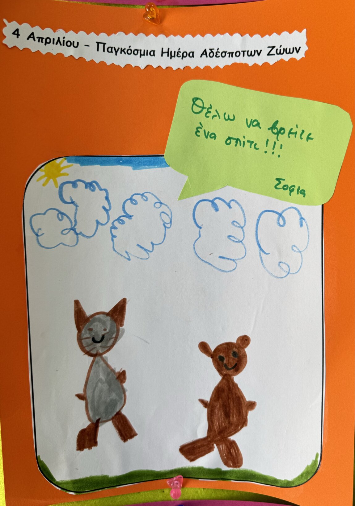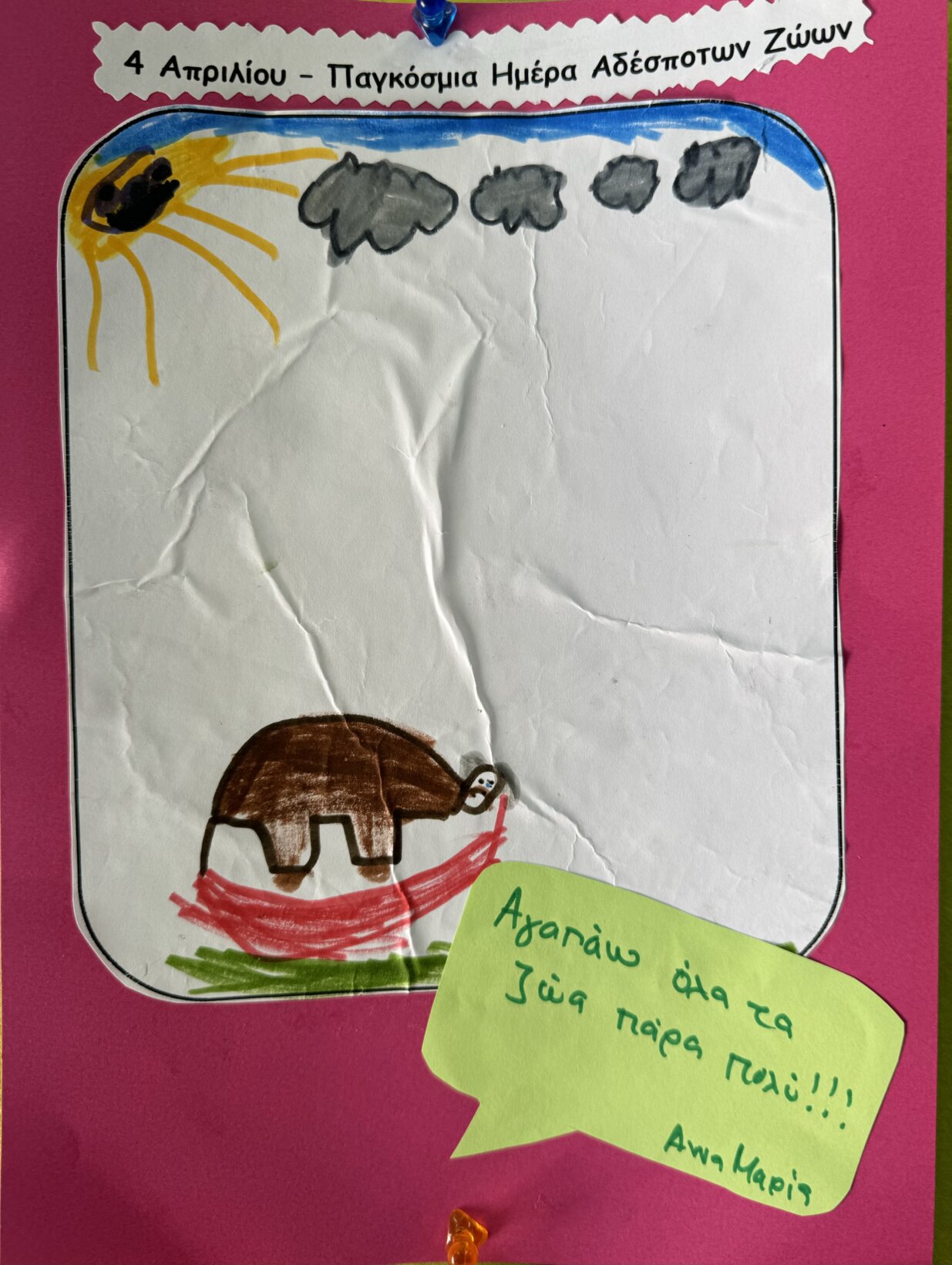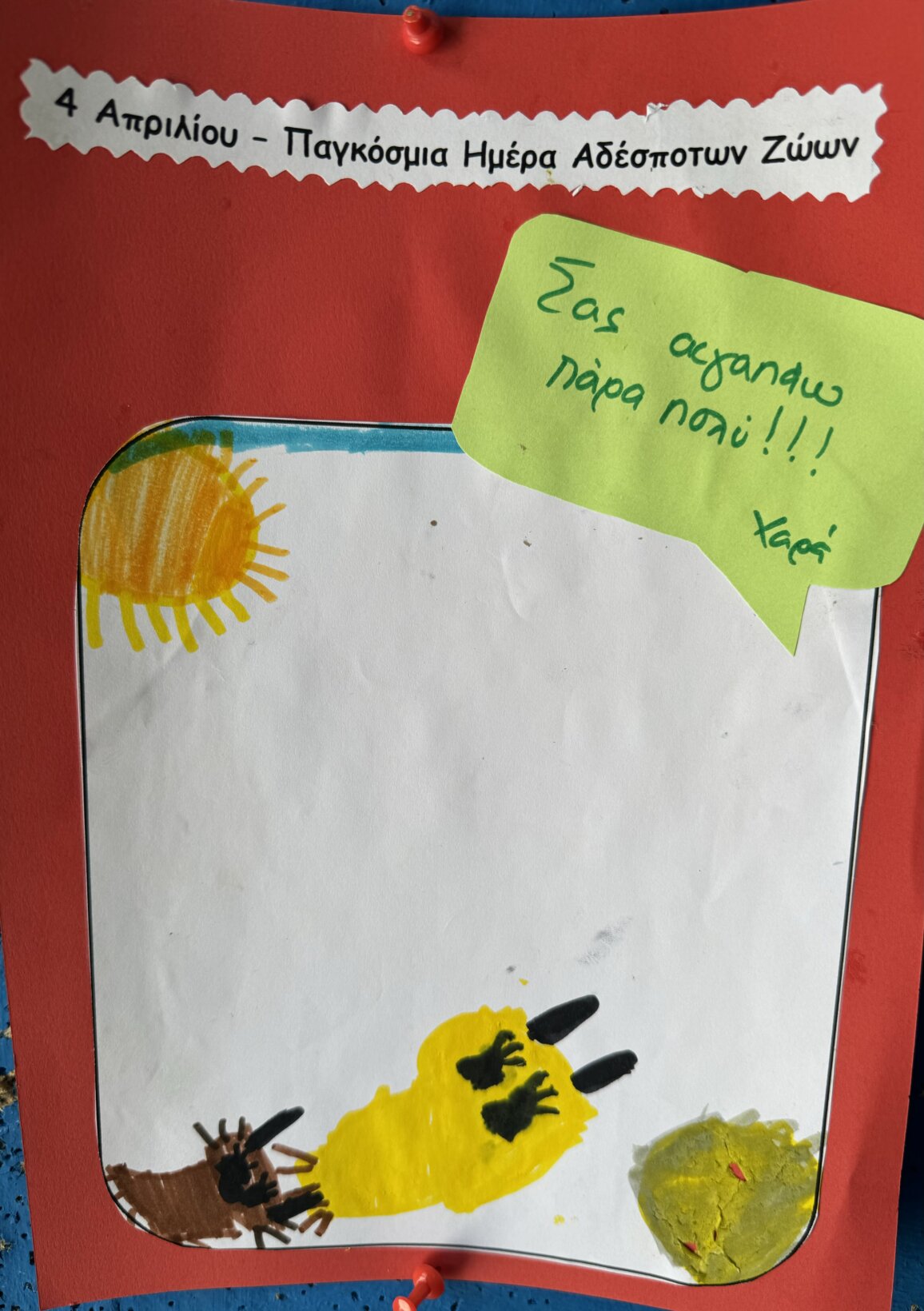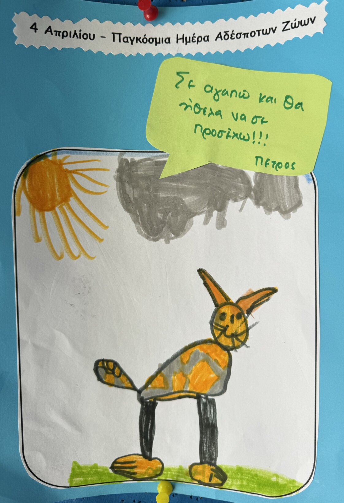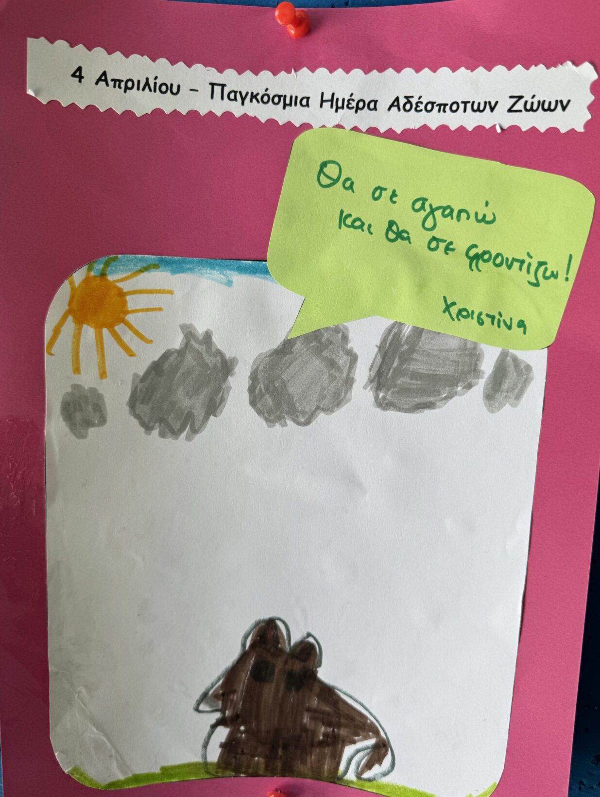 Την ημέρα αυτή, που αποτελεί την Παγκόσμια Ημέρα Αδέσποτων Ζώων, πραγματοποιούνται στα Νηπιαγωγεία, Δημοτικά, Γυμνάσια και Λύκεια, καθώς και στα ομογενειακά σχολεία του εξωτερικού, μια σειρά από δραστηριότητες, συμπεριλαμβανομένων εκπαιδευτικών δράσεων, ενημερώσεων, εκπαιδευτικών επισκέψεων σε χώρους φιλοξενίας και προστασίας αδέσποτων ή άγριων ζώων, σεμιναρίων για την παροχή πρώτων βοηθειών και φροντίδας σε αδέσποτα ζώα, εκπαιδευτικών προγραμμάτων και εκδηλώσεων (π.χ. θεατρικών παραστάσεων, καλλιτεχνικών εκθέσεων, κ.λπ.). Έτσι και εμείς αφιερώσαμε την ημέρα μας σε δράσεις για τη συγκεκριμένη ημέρα.