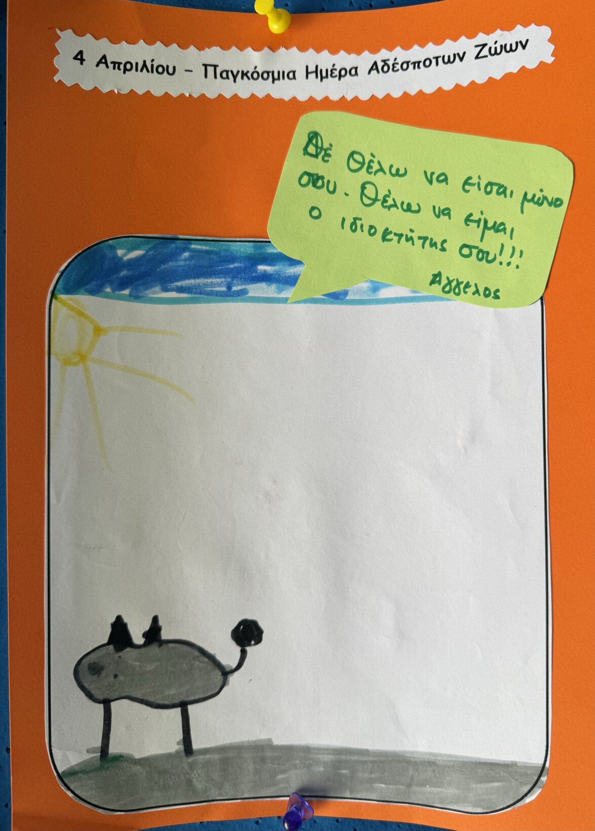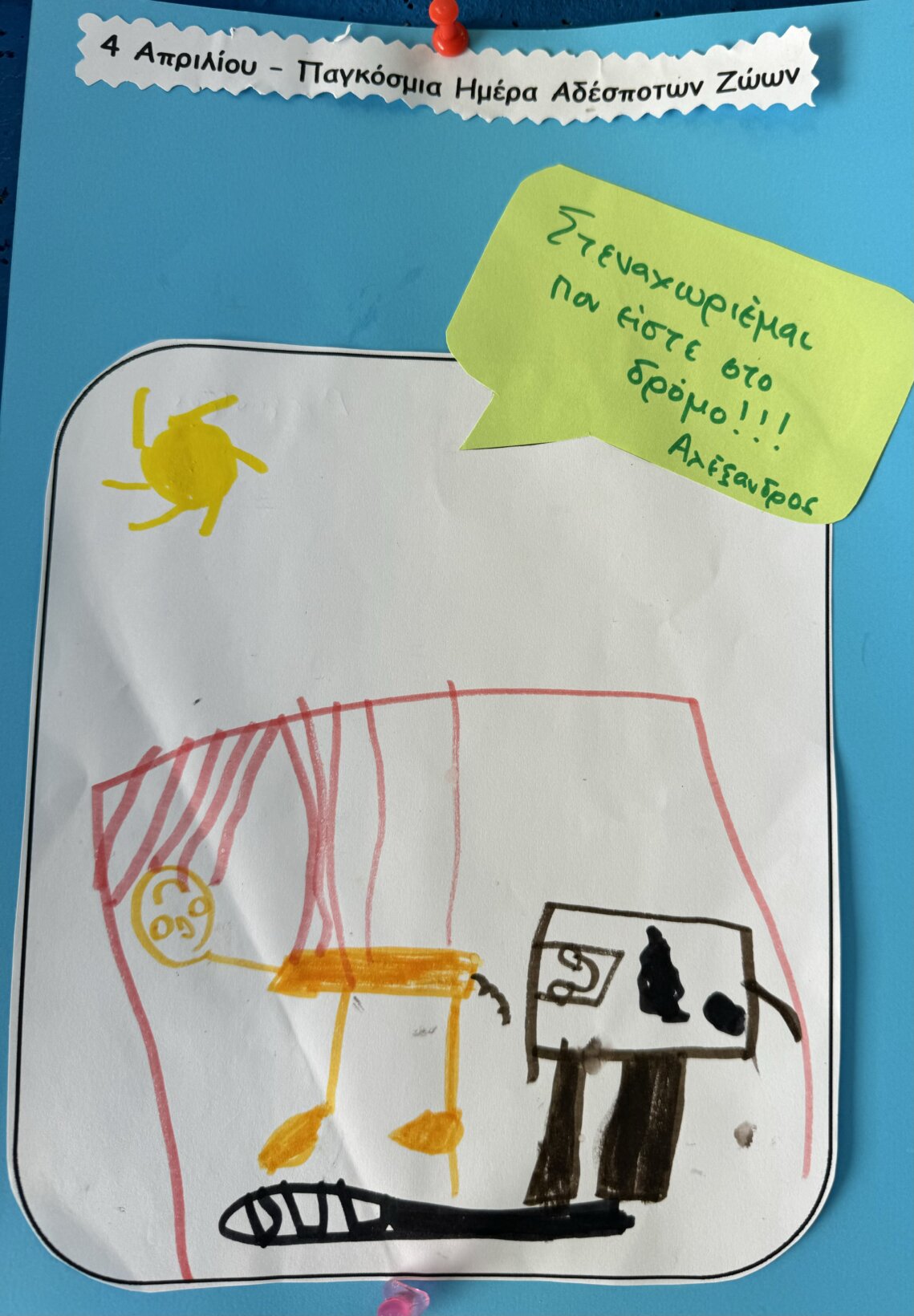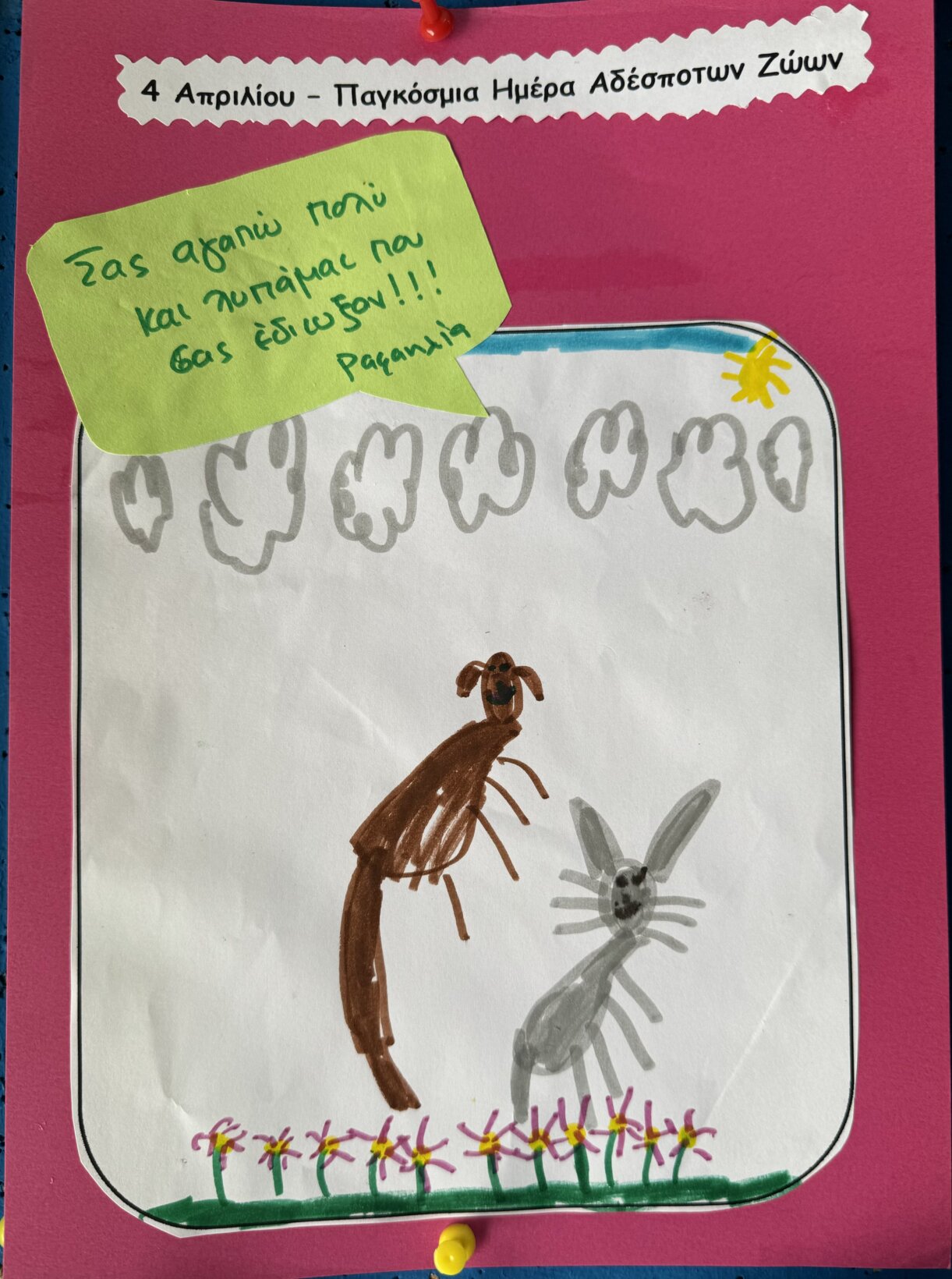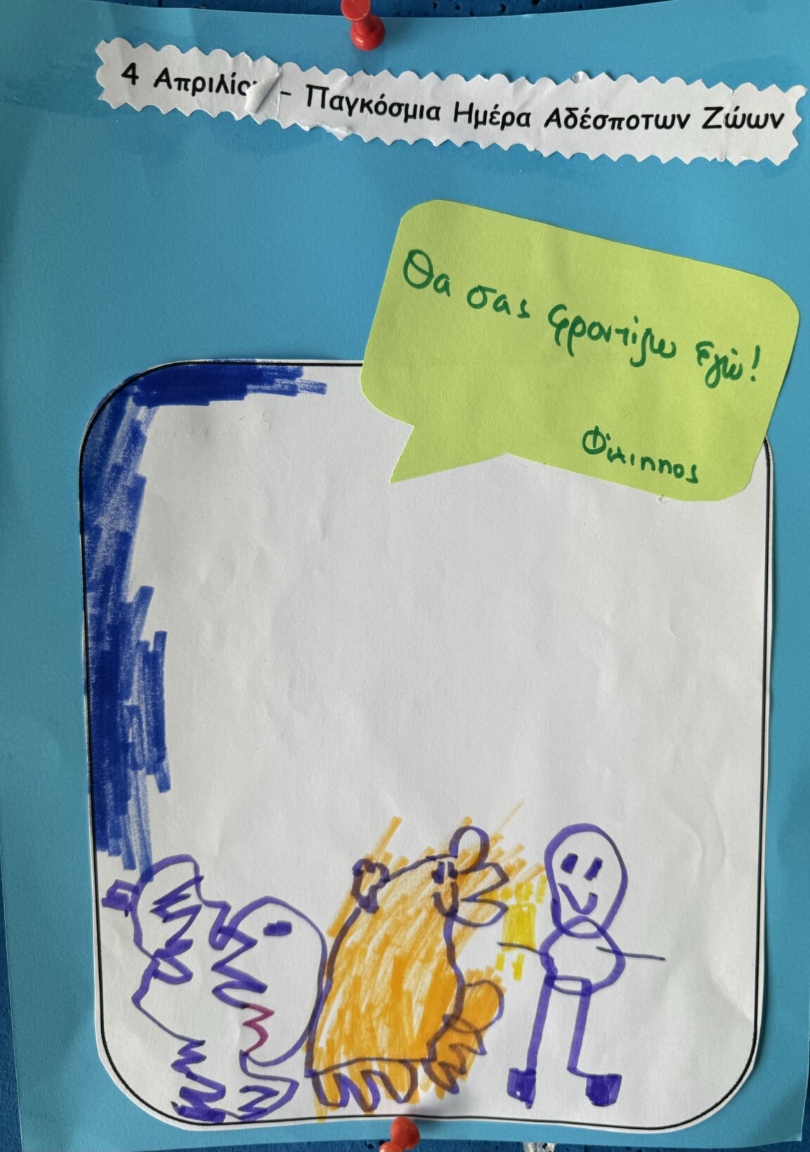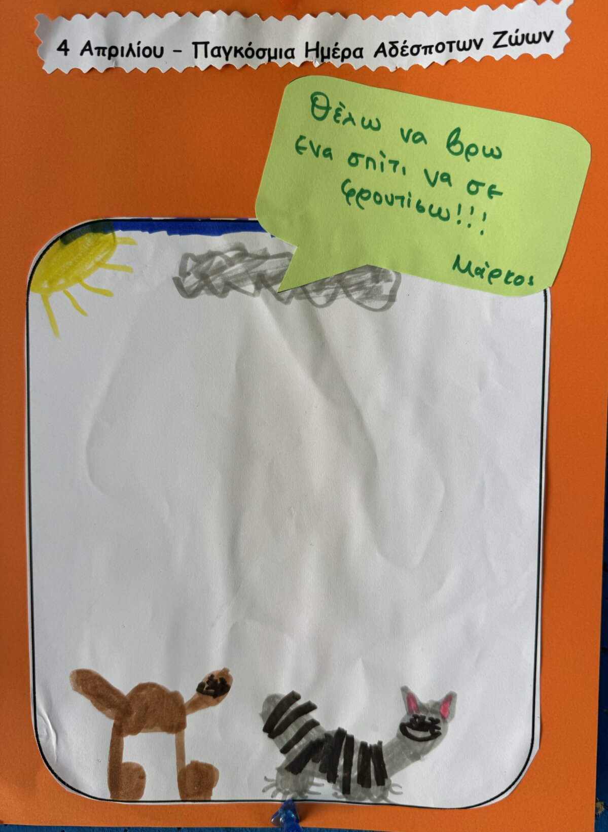 Την ημέρα αυτή, που αποτελεί την Παγκόσμια Ημέρα Αδέσποτων Ζώων, πραγματοποιούνται στα Νηπιαγωγεία, Δημοτικά, Γυμνάσια και Λύκεια, καθώς και στα ομογενειακά σχολεία του εξωτερικού, μια σειρά από δραστηριότητες, συμπεριλαμβανομένων εκπαιδευτικών δράσεων, ενημερώσεων, εκπαιδευτικών επισκέψεων σε χώρους φιλοξενίας και προστασίας αδέσποτων ή άγριων ζώων, σεμιναρίων για την παροχή πρώτων βοηθειών και φροντίδας σε αδέσποτα ζώα, εκπαιδευτικών προγραμμάτων και εκδηλώσεων (π.χ. θεατρικών παραστάσεων, καλλιτεχνικών εκθέσεων, κ.λπ.). Έτσι και εμείς αφιερώσαμε την ημέρα μας σε δράσεις για τη συγκεκριμένη ημέρα.