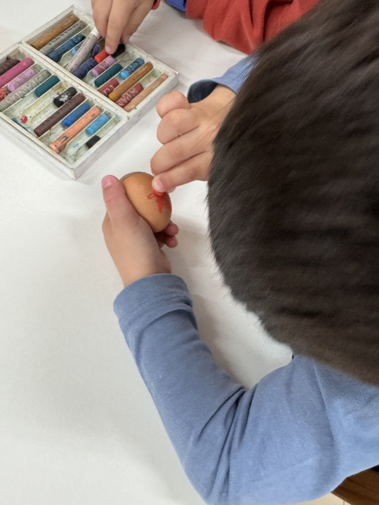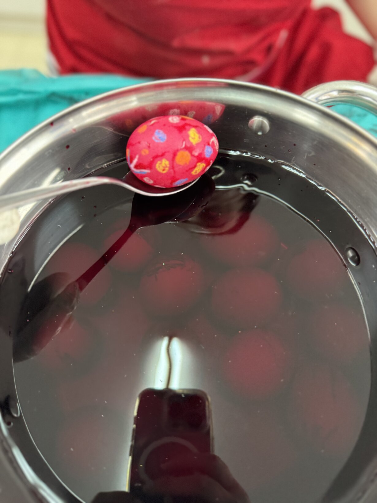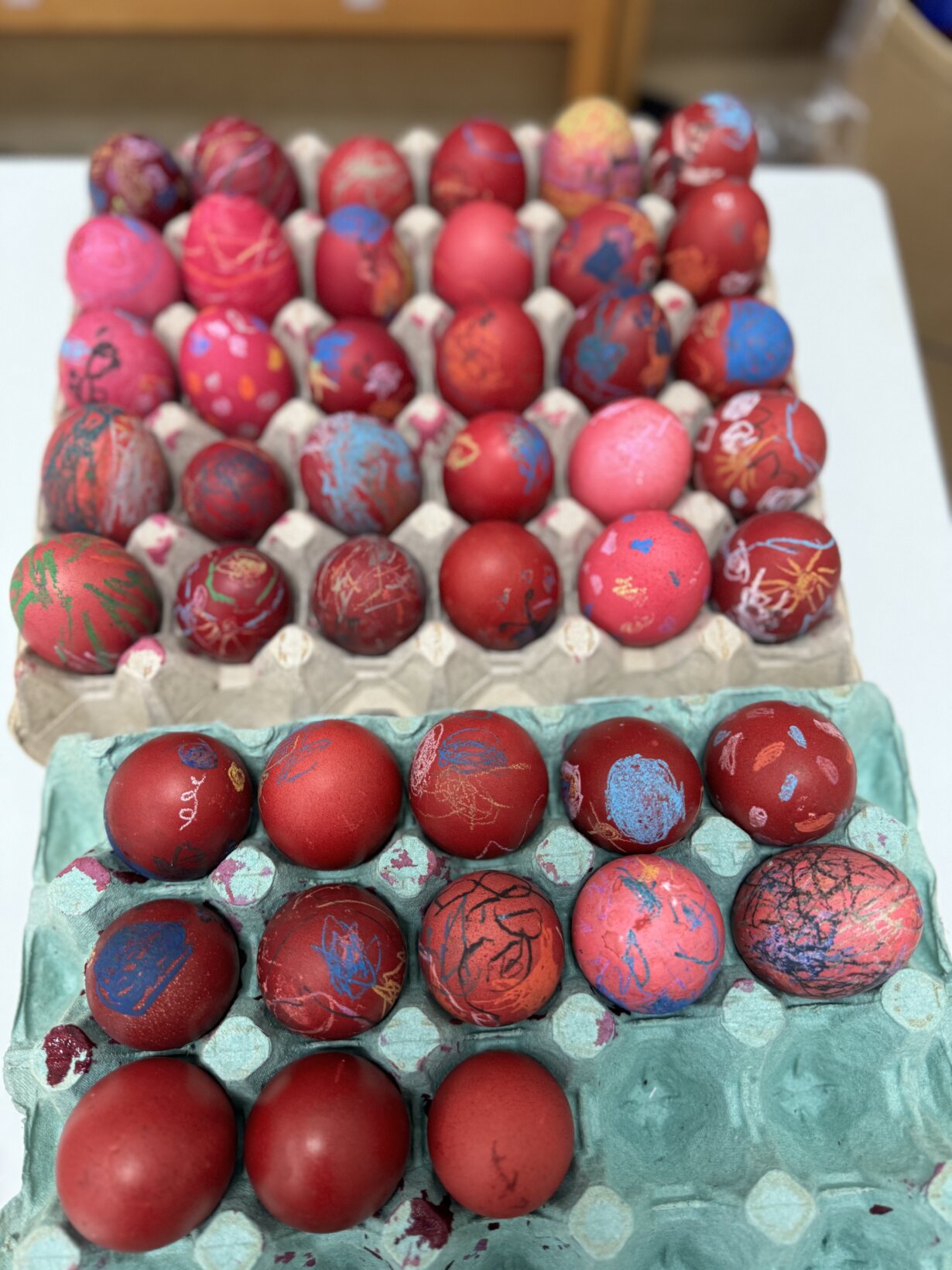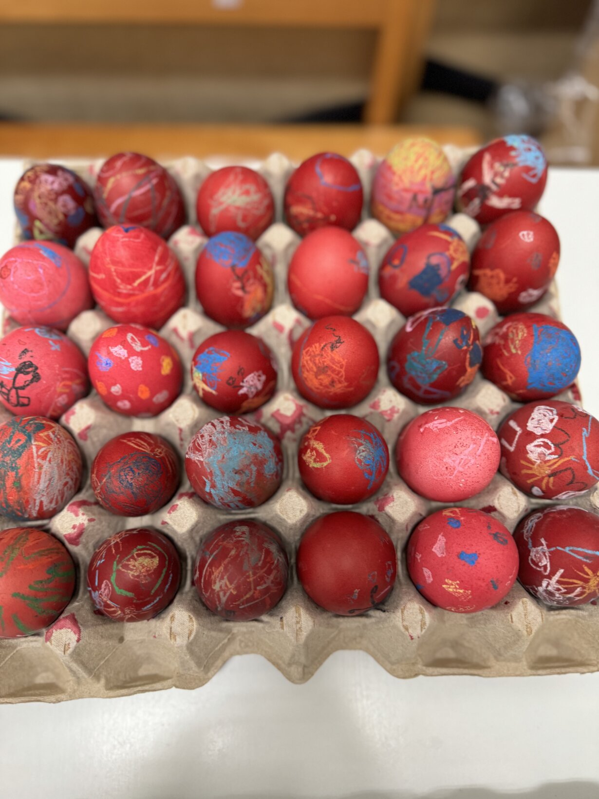 - Βάψαμε κόκκινα τα αυγά μας αφού πρώτα τα ζωγραφίσαμε με κηρομπογιά