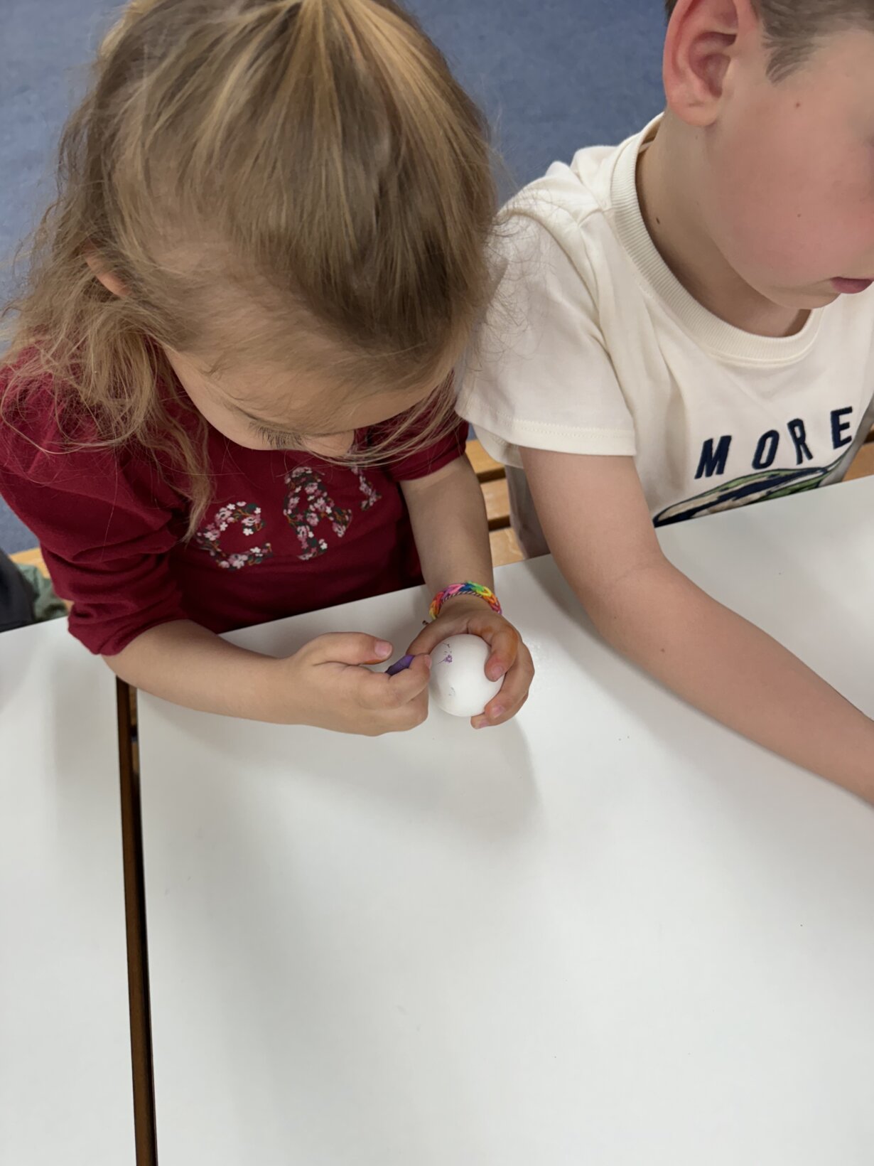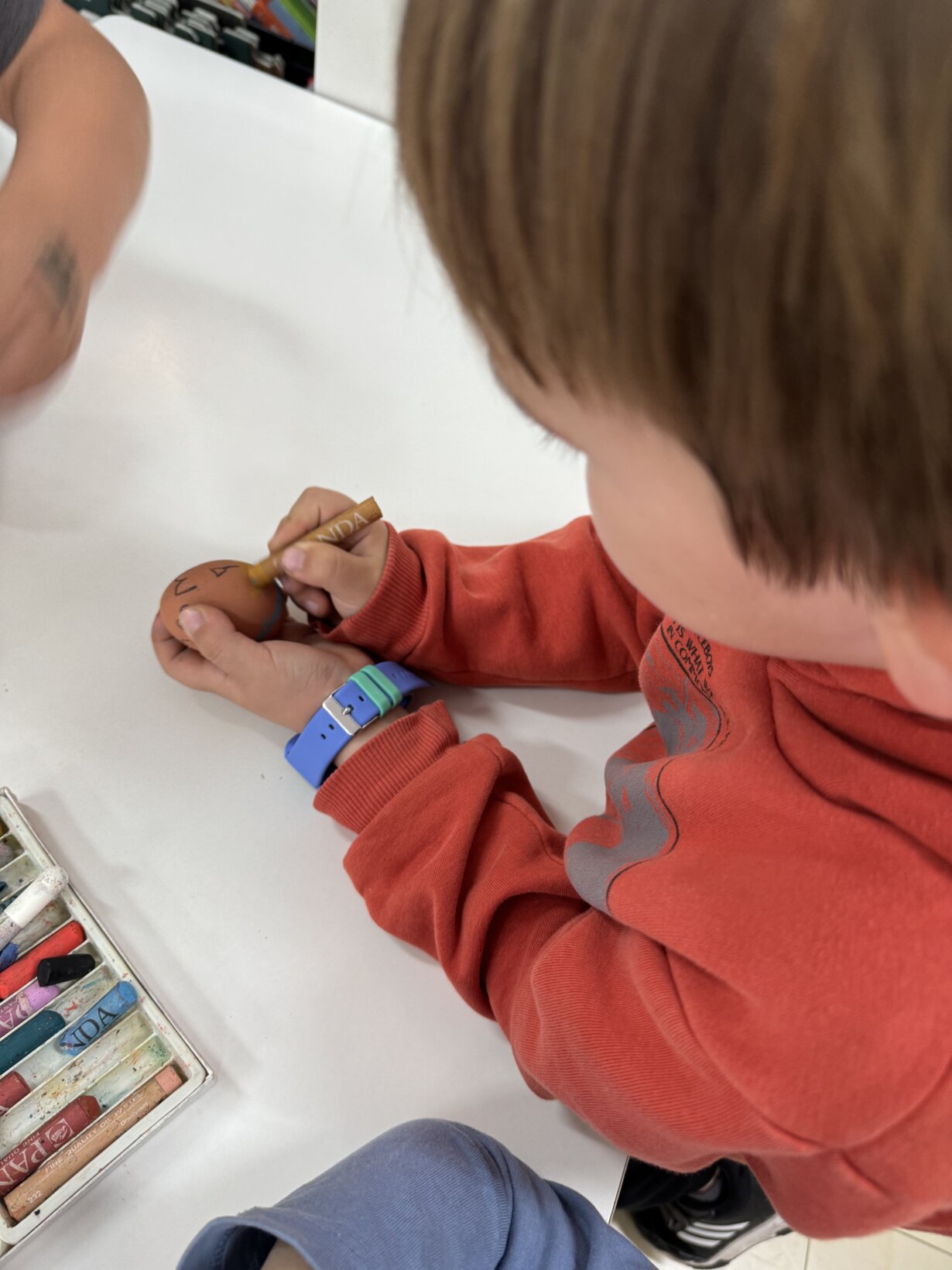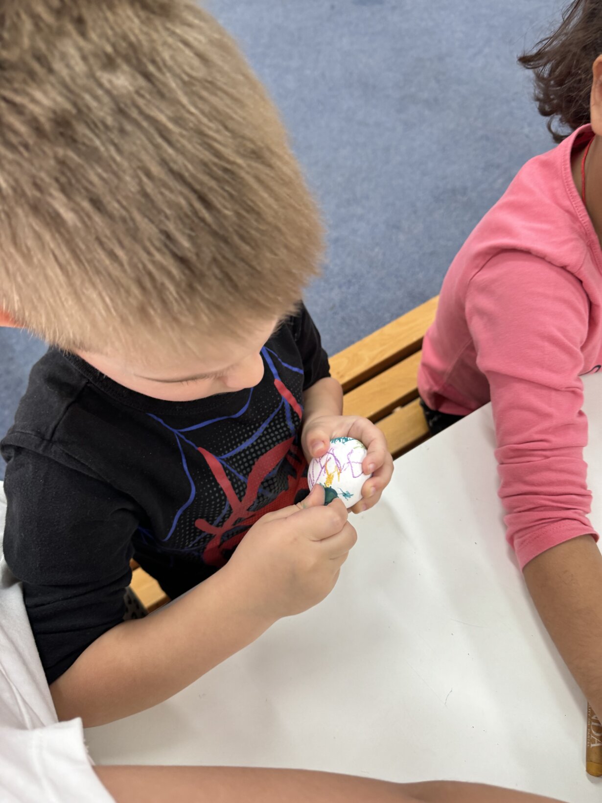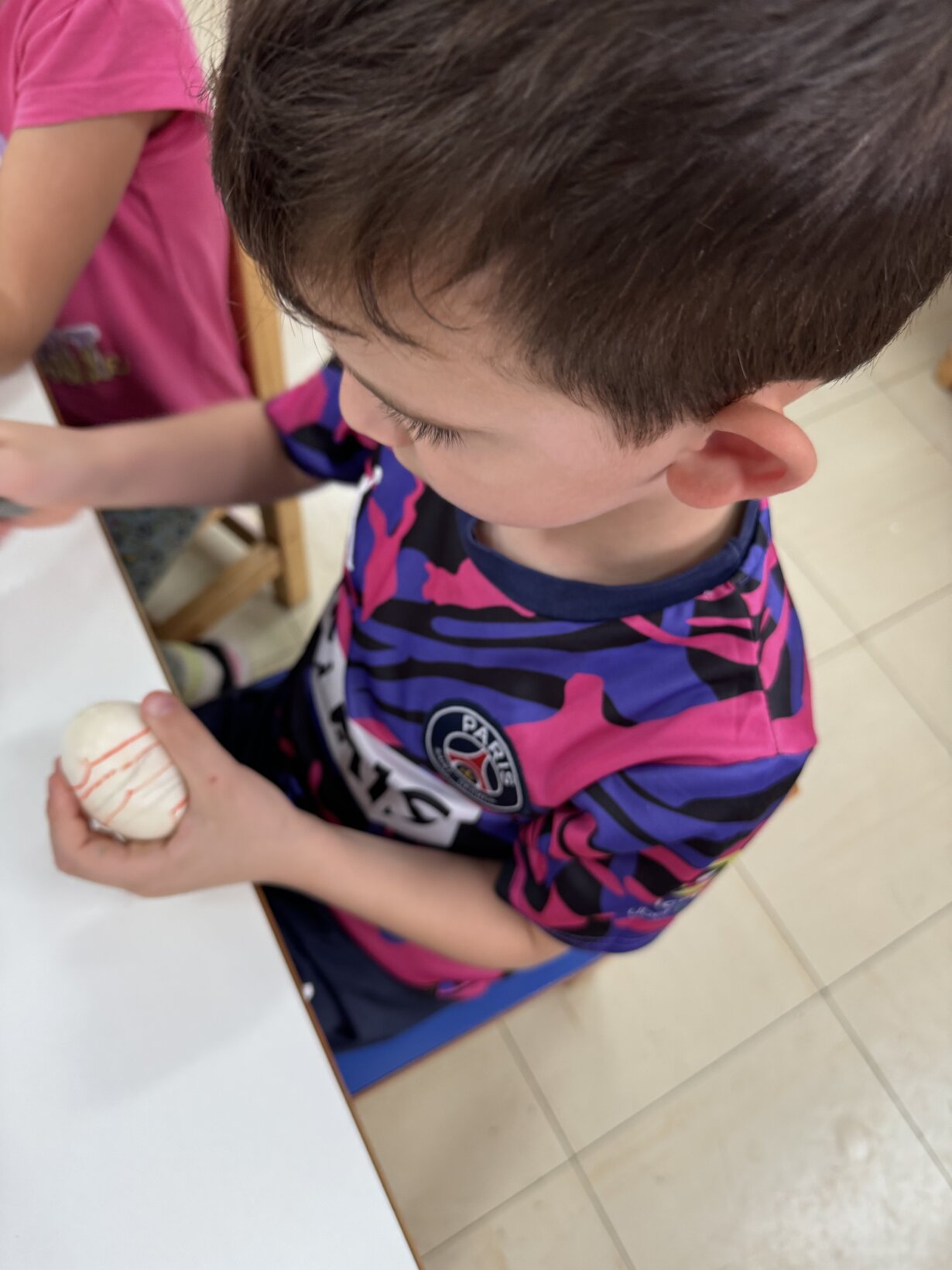 - Βάψαμε κόκκινα τα αυγά μας αφού πρώτα τα ζωγραφίσαμε με κηρομπογιά
