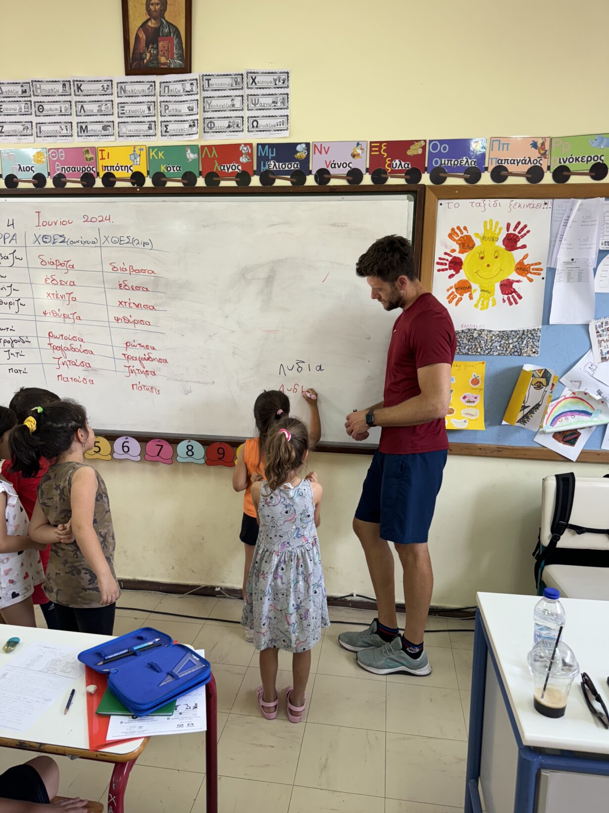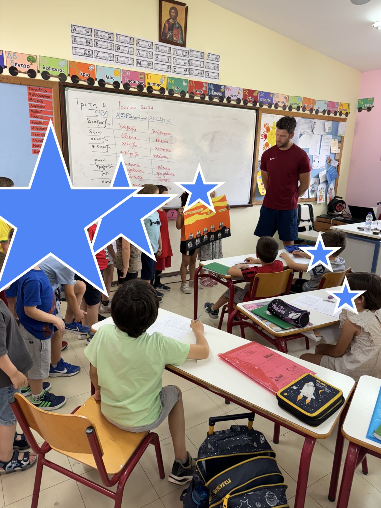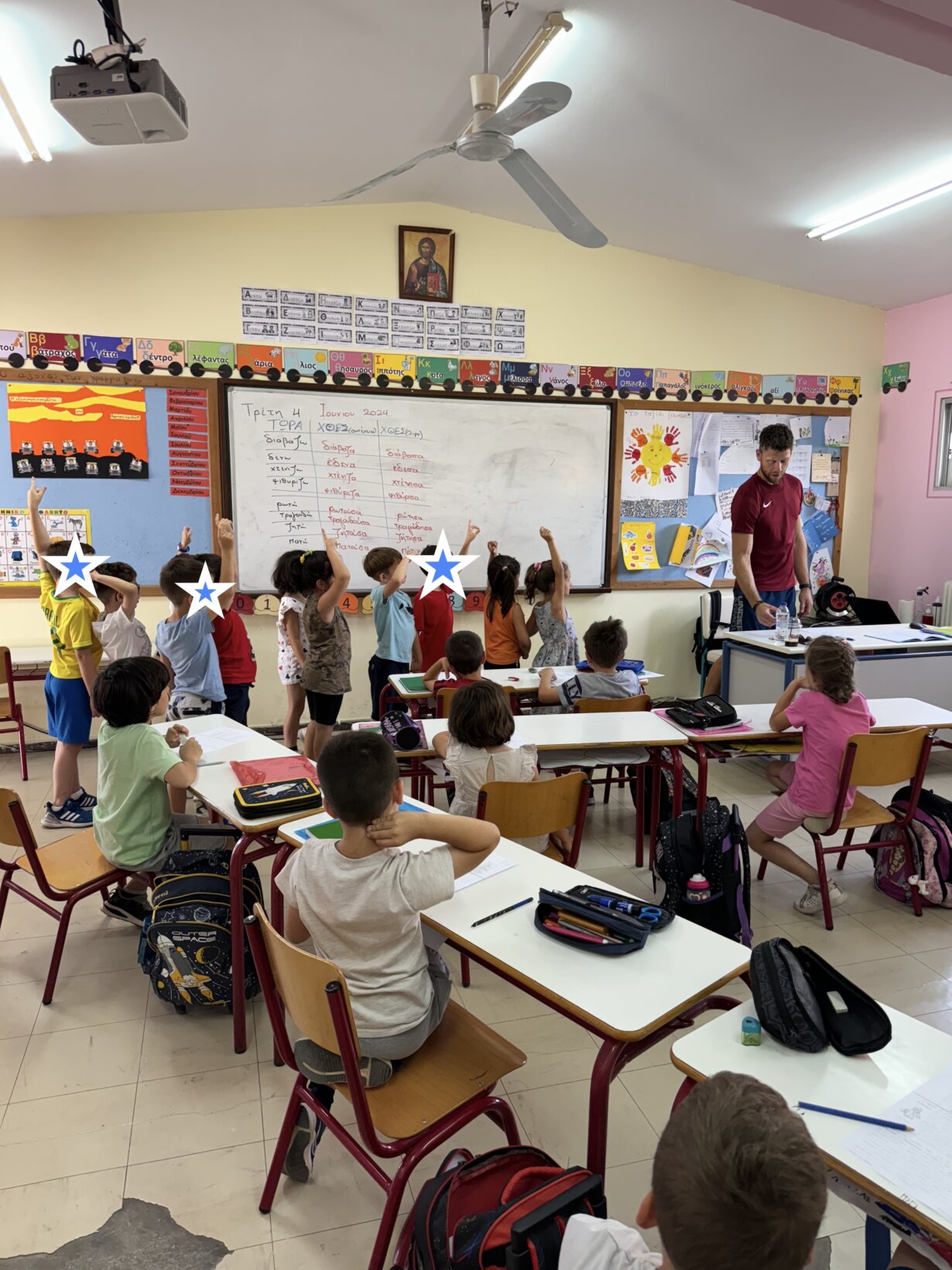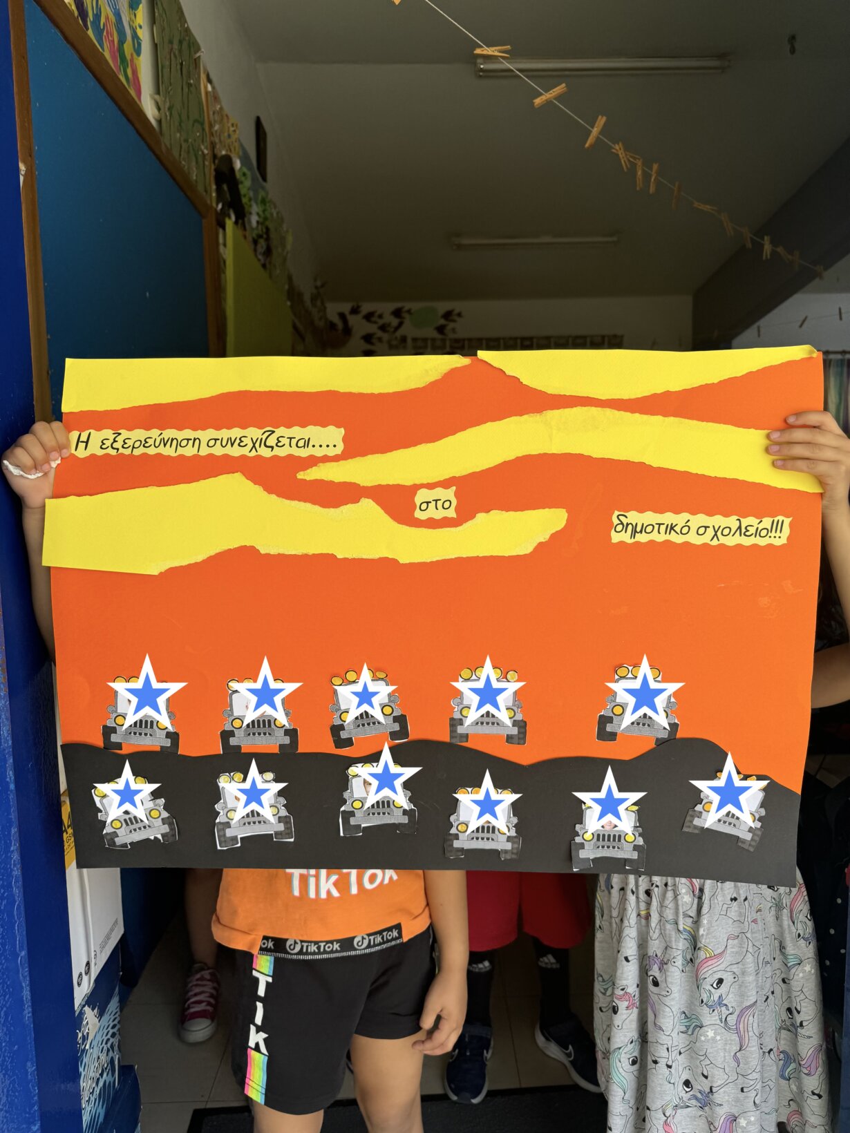 Σήμερα επισκεφτήκαμε τα παιδιά της Α΄τάξης του συστεγαζόμενου 18ου Δημ. Σχολείου. Εκεί μας περίμεναν οι περσινοί μας φίλοι και ο δάσκαλος τους κος Βαγγέλης Χατζής με μεγάλη χαρά. Σκοπός της επίσκεψής μας ήταν να γνωρίσουμε από κοντά πως είναι το δημοτικό που σε λίγους μήνες τα νηπιάκια μας θα πάνε και να μας λύσουν οι φίλοι μας όλες τις απορίες μας. Βέβαια δεν θα μπορούσαμε να τους επισκεφτούμε χωρίς το δώρο μας. Μια ομαδική εργασία όπου θα περιμένει τα παιδιά όταν αυτά με τη σειρά τους θα πάνε στην Α΄τάξη. “Το ταξίδι της εξερεύνησης συνεχίζεται και στο Δημοτικό”