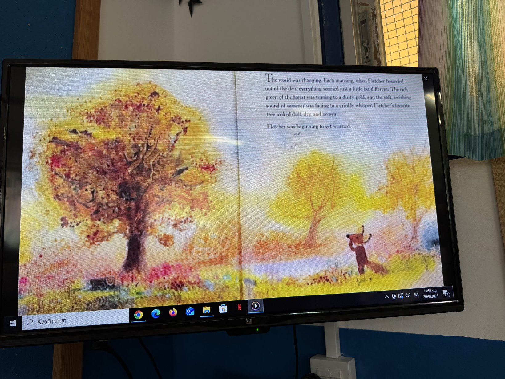 Ακούσαμε το παραμύθι “Ο Φλέτσερ και τα φθινοπωρινά φύλλα” και μάθαμε γιατί τα φυλλαράκια το φθινόπωρο χάνουν το χρώμα τους και πέφτουν.