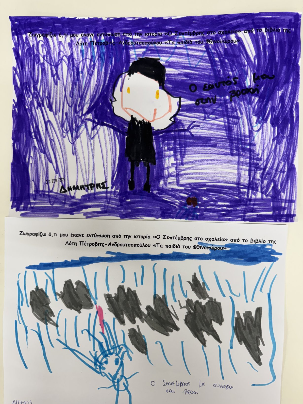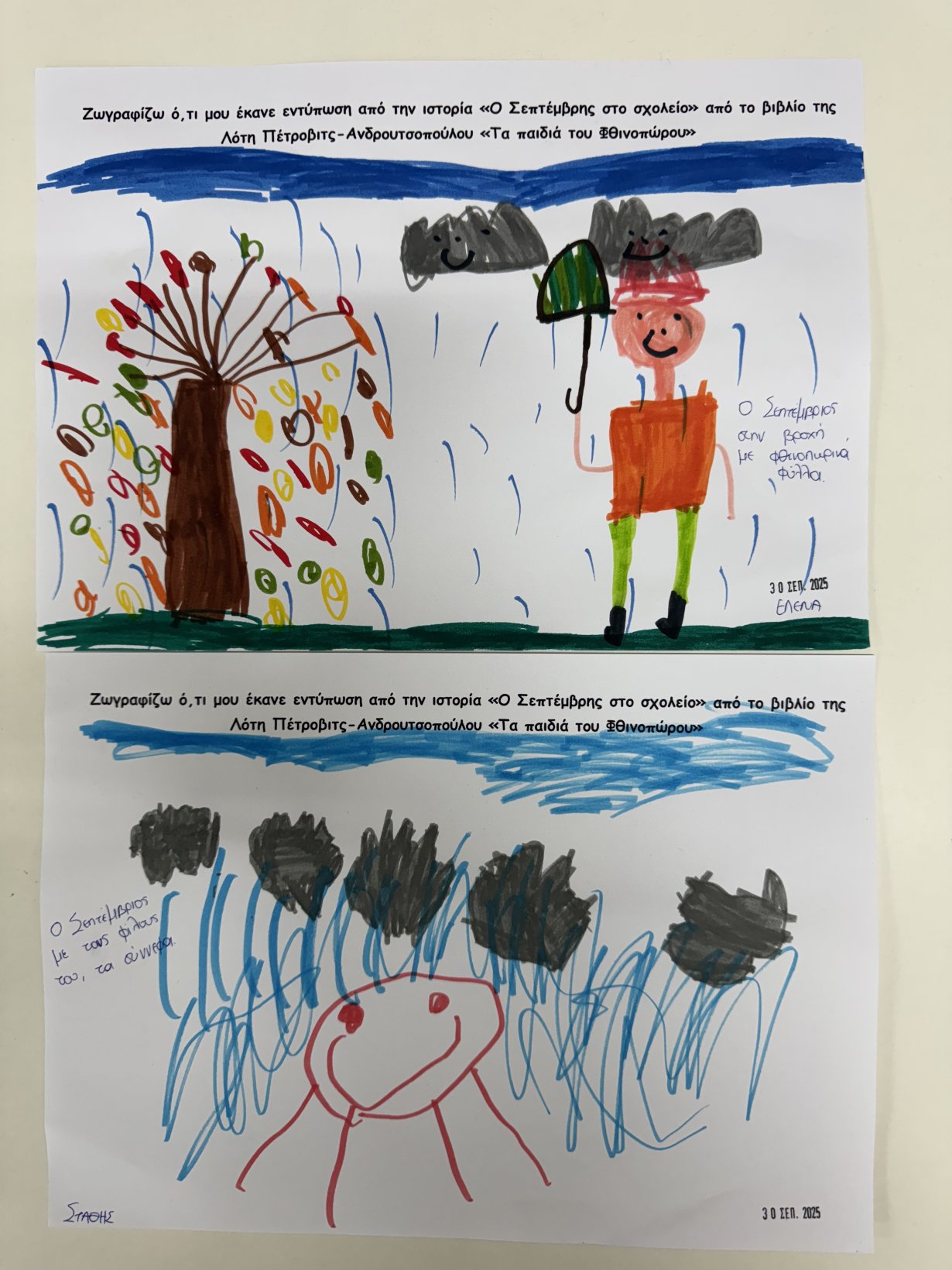 Διαβάσαμε από το βιβλίο της Λότη Πέτροβιτς-Ανδρουτσοπούλου “Τα παιδιά του Φθινοπώρου” την ιστορία “Ο Σεπτέμβρης στο σχολείο” και ζωγραφίσαμε τι μας άρεσε από το παραμύθι πιο πολύ!!!!!