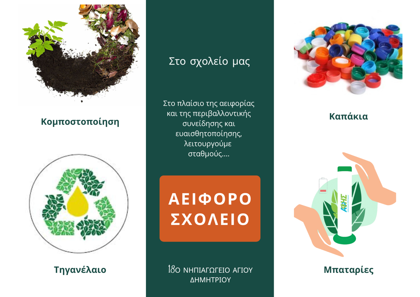 - Ο περιβάλλων χώρος του νηπιαγωγείου είναι ευχάριστος καθώς διαθέτει μικρό κήπο με δέντρα, θάμνους, αρωματικά, καλλωπιστικά φυτά και βότανα, τα οποία έχουν φυτέψει εκπαιδευτικοί και μαθητές. Κάθε χρόνο συντηρούμε τον λαχανόκηπο και προωθούμε την κουλτούρα της επανάχρησης, της ανακύκλωσης και της κομποστοποίησης.