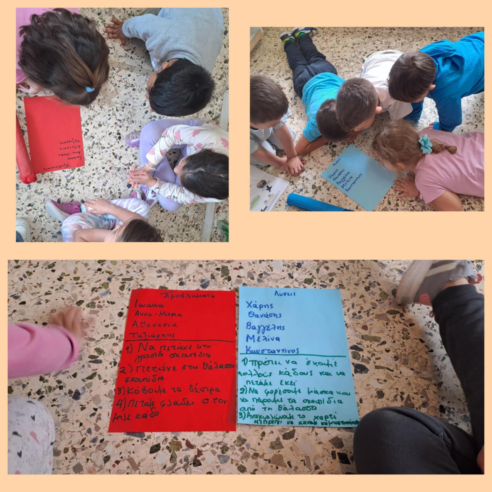 Συνεργάστηκαν ανά ζεύγη και ταξινόμησαν τις εργασίες τους δημιουργώντας ένα «Τοίχο προβλημάτων και λύσεων» (π.χ. πρόβλημα-το πέταγμα των σκουπιδιών στο δρόμο λύση-χρήση κάδων, πρόβλημα-καταστροφή δασών λύση-ανακύκλωση χαρτιού)