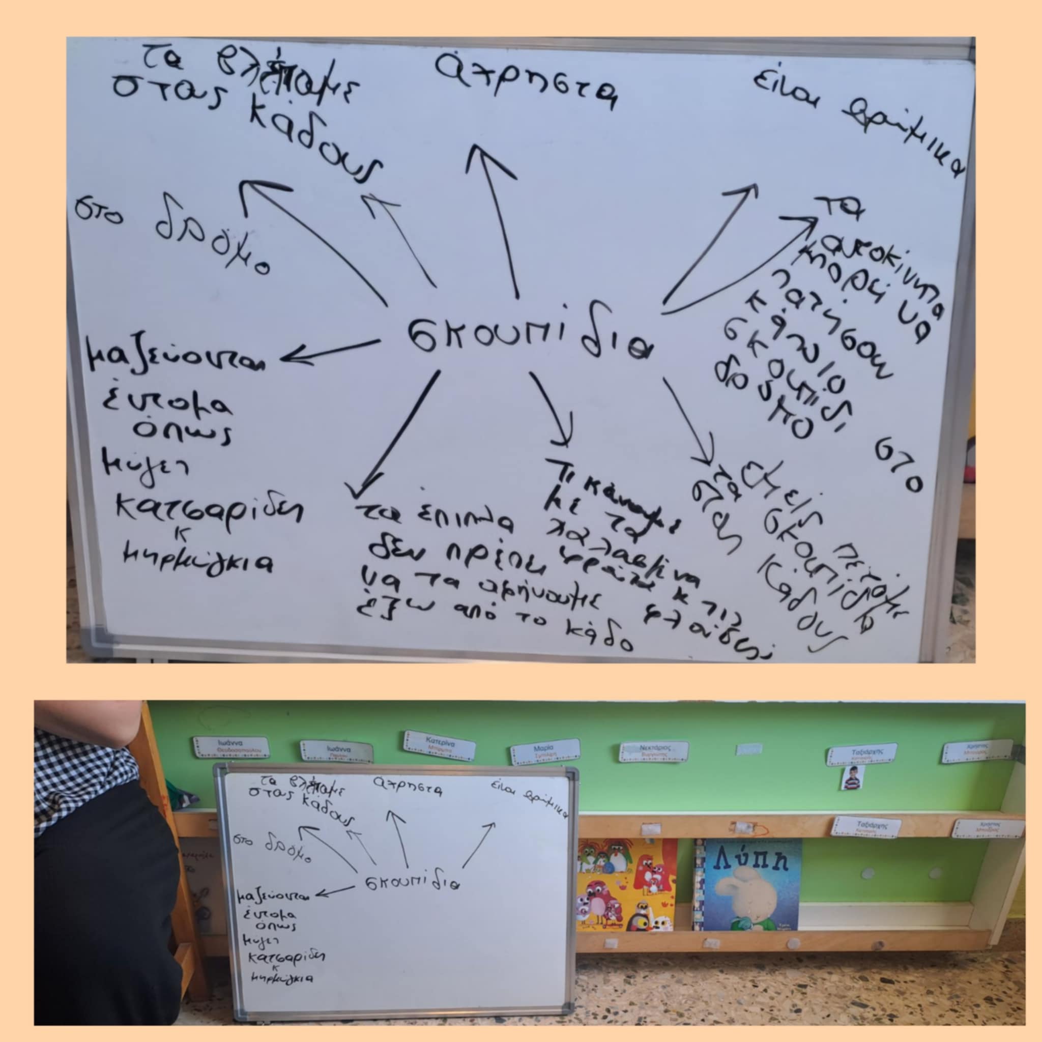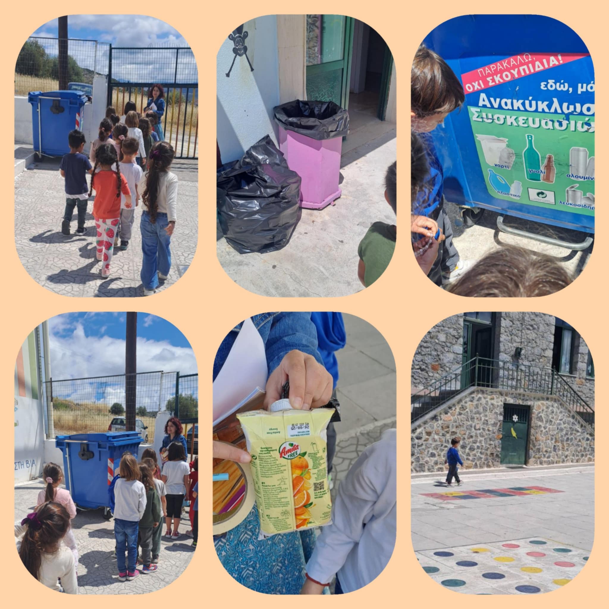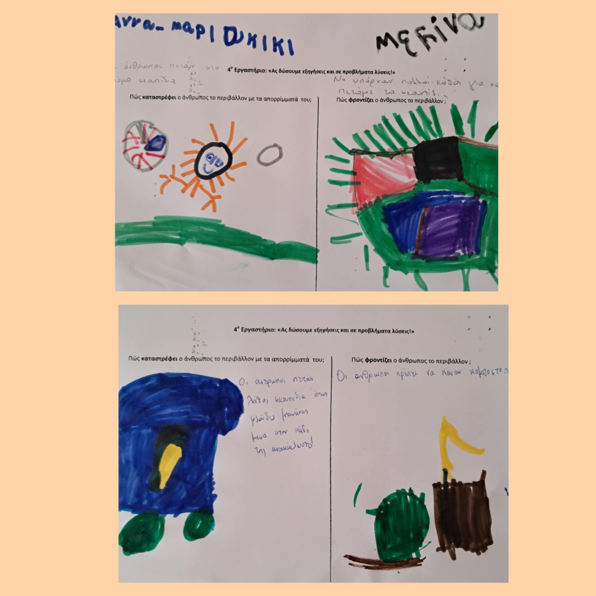 Τα παιδιά παρακολούθησαν σχετικό βίντεο, παρατήρησαν πώς τα απορρίμματα κάνουν κακό στο περιβάλλον. Μίλησαν για τη δική τους γειτονιά και ερωτήθηκαν πώς θα ήταν ο τόπος τους με καλή διαχείριση απορριμμάτων και πως με κακή διαχείριση και ύστερα το αποτύπωσαν σε φύλλο εργασίας.
