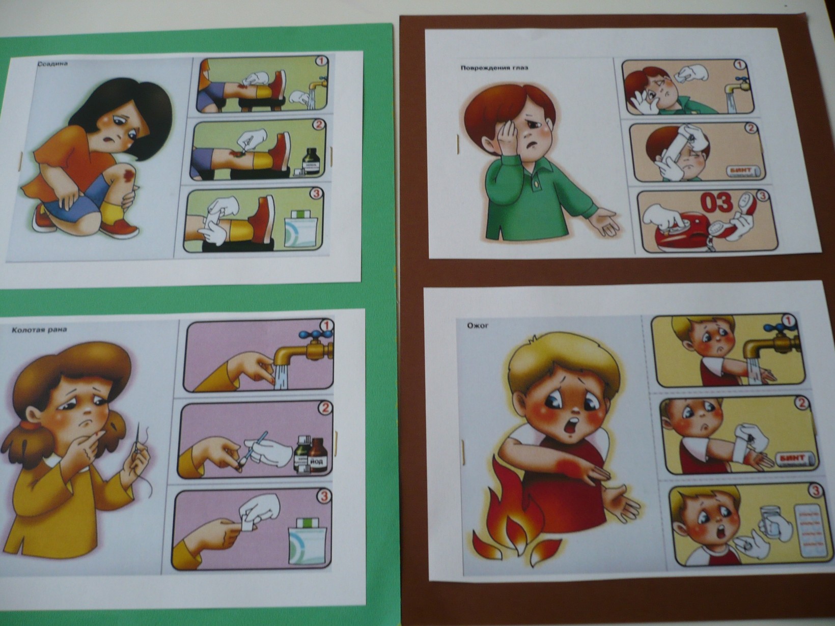 Προστατευτικά. Τραυμαπλαστ. Γάζες. Ελαστικός επίδεσμος. Βαμβάκι. Φάρμακα. Οξυζενέ. Οινόπνευμα. Αντισηπτικό. Αντισταμινική αλοιφή. Κρέμα για εγκαύματα. Αντιβιοτικό σπρέι. Εργαλεία. Αυτοκόλλητη ταινία για γάζες. Ψαλίδι. Τσιμπιδάκι. Θερμόμετρο.