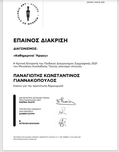Ο μαθητής του Νηπιαγωγείου μας Γιαννακόπουλος Κωνσταντίνος, ο Κωνσταντίνος μας, διακρίθηκε στον παιδικό διαγωνισμό ζωγραφικής του Μουσείου Κυκλαδικής Τέχνης “Καθημερινοί Ήρωες”