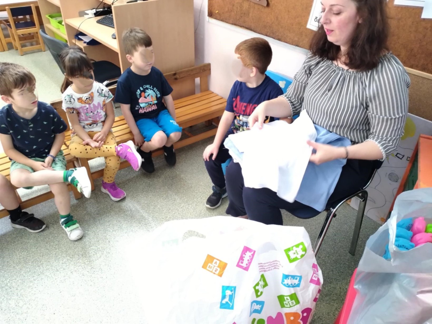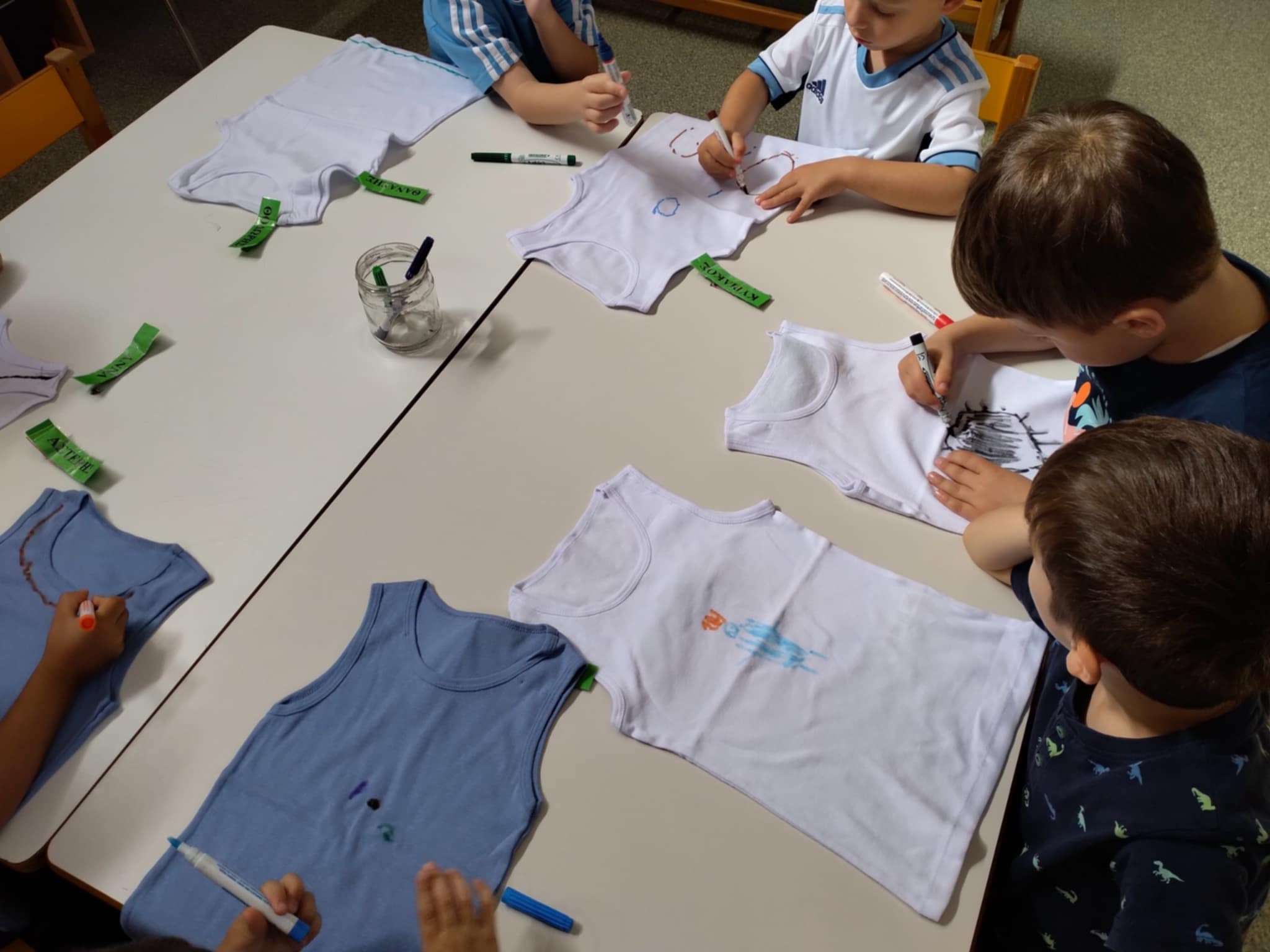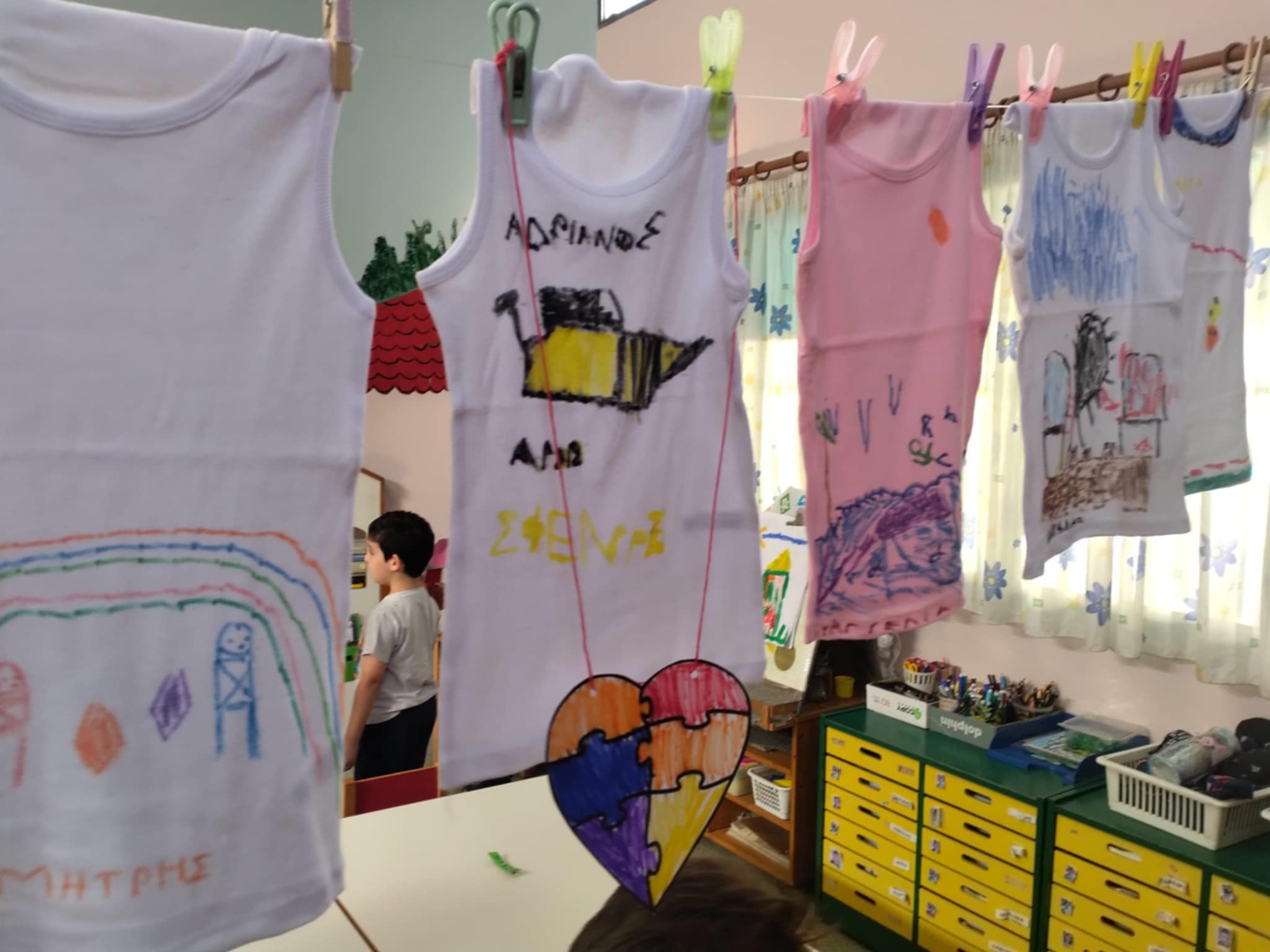 μαμάς και γιου, η μπουγάδα. Όπως ο μικρός Γιώργος βοηθάει τη μαμά του να απλώσει τα φρεσκοπλυμένα ρούχα, έτσι βοήθησε κι εμάς να βάλουμε πάνω στα φανελάκια μας στιγμές που μας γεμίζουν ευτυχία.Οι δημιουργίες αυτές δημιούργησαν την έκθεση με τίτλο ” Η Μπουγάδα της Ευτυχίας ” και φυσικά στα εγκαίνιά της καλεσμένοι ήταν οι μαθητές του 2ου τμήματος.