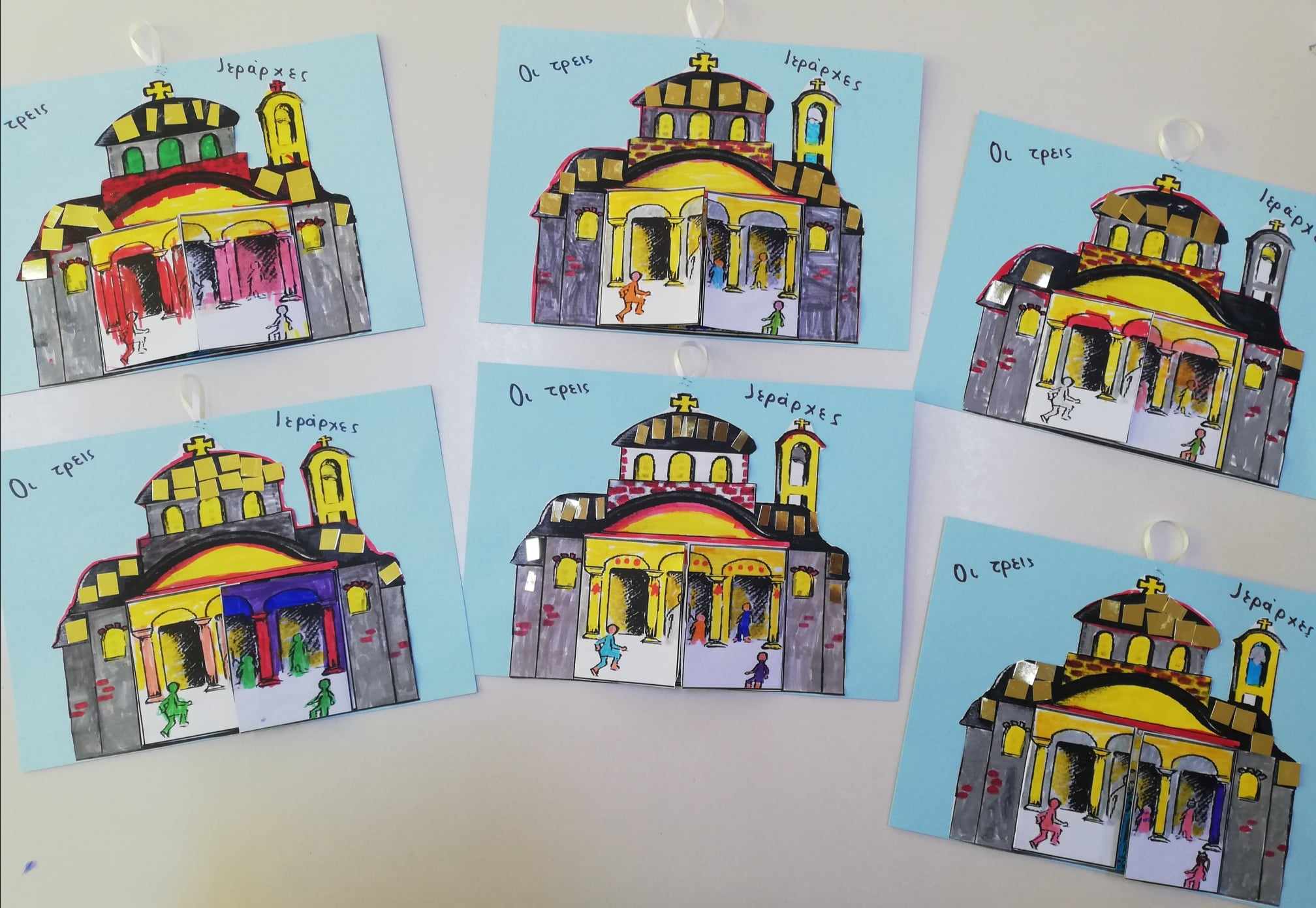 Στη συνέχεια τα παιδιά κατασκεύασαν εκκλησίες, αλλά και τις εικόνες των τριών Ιεραρχών, τις οποίες πήραν μαζί τους φεύγοντας