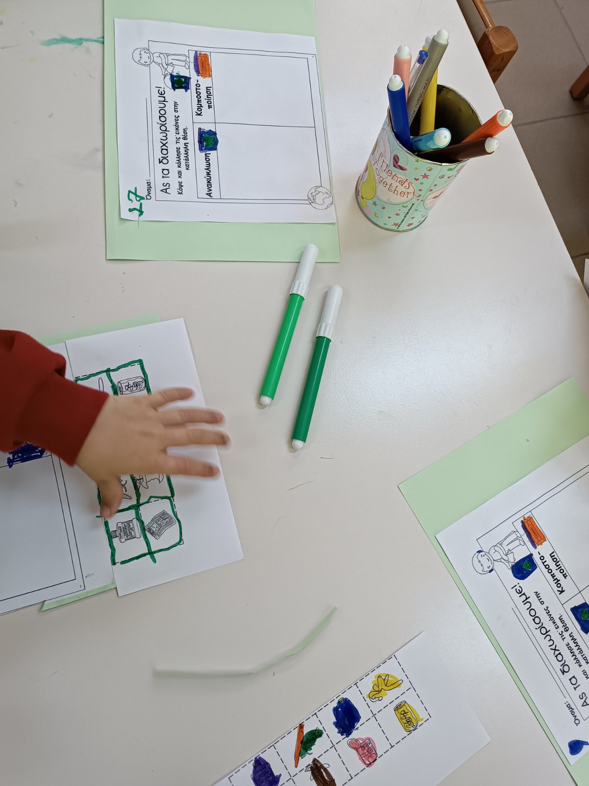 Σε επόμενη δραστηριότητα, τα παιδιά έκοψαν εικόνες ανακύκλωσης και κομποστοποίησης και έπρεπε να τις κολλήσουν στην αντίστοιχη κατηγορία
