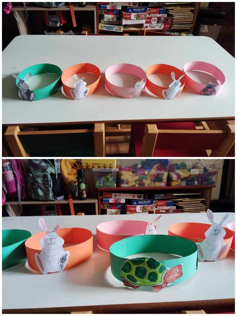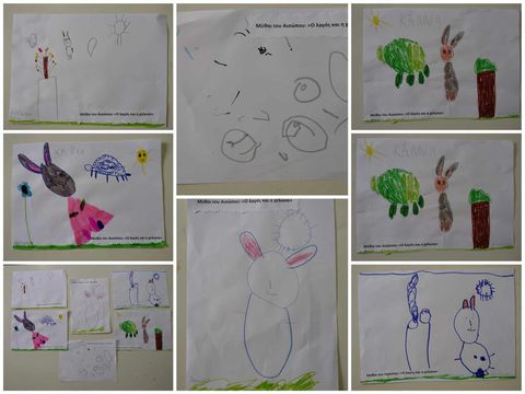 Αργότερα ασχοληθήκαμε με τον μύθο: “Ο Λαγός και η Χελώνα”. Αποφασίσαμε να τον δραματοποιήσουμε και μοιράσαμε ρόλους. Ποιος θα είναι λαγός και ποιος χελώνα. Φτιάξαμε λοιπόν στεφανάκια που πάνω κόλλησε ο καθένας τη φιγούρα του και ξεκινήσαμε. Θέσαμε ερωτήματα του τύπου: