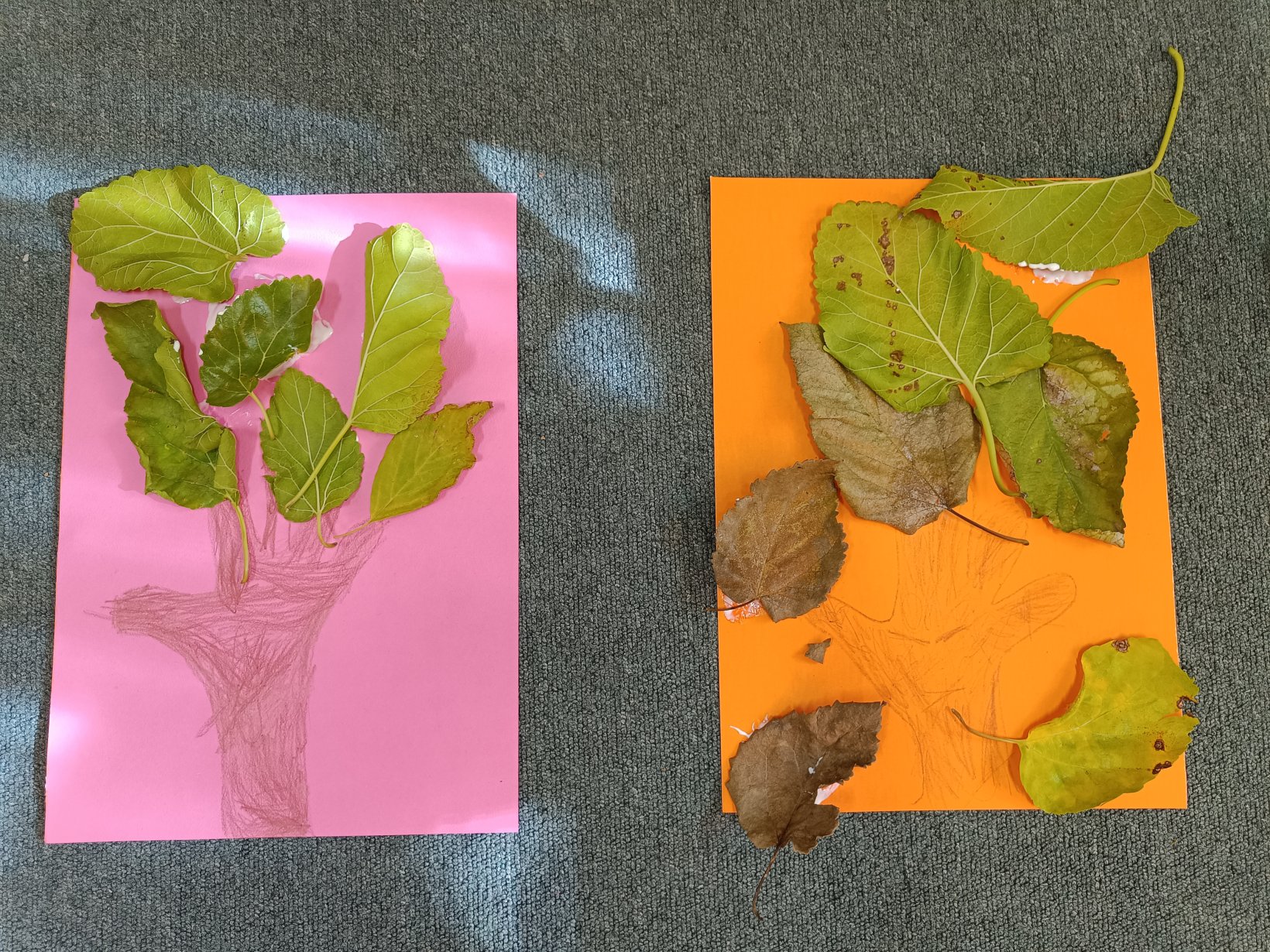 Μιλήσαμε για τα αειθαλή και φυλλοβόλα δέντρα, διευκρινίσαμε τις διαφορές τους, κι έπειτα βγήκαμε να μαζέψουμε φύλλα από την αυλή, για να φτιάξουμε τα δικά μας δεντράκια!