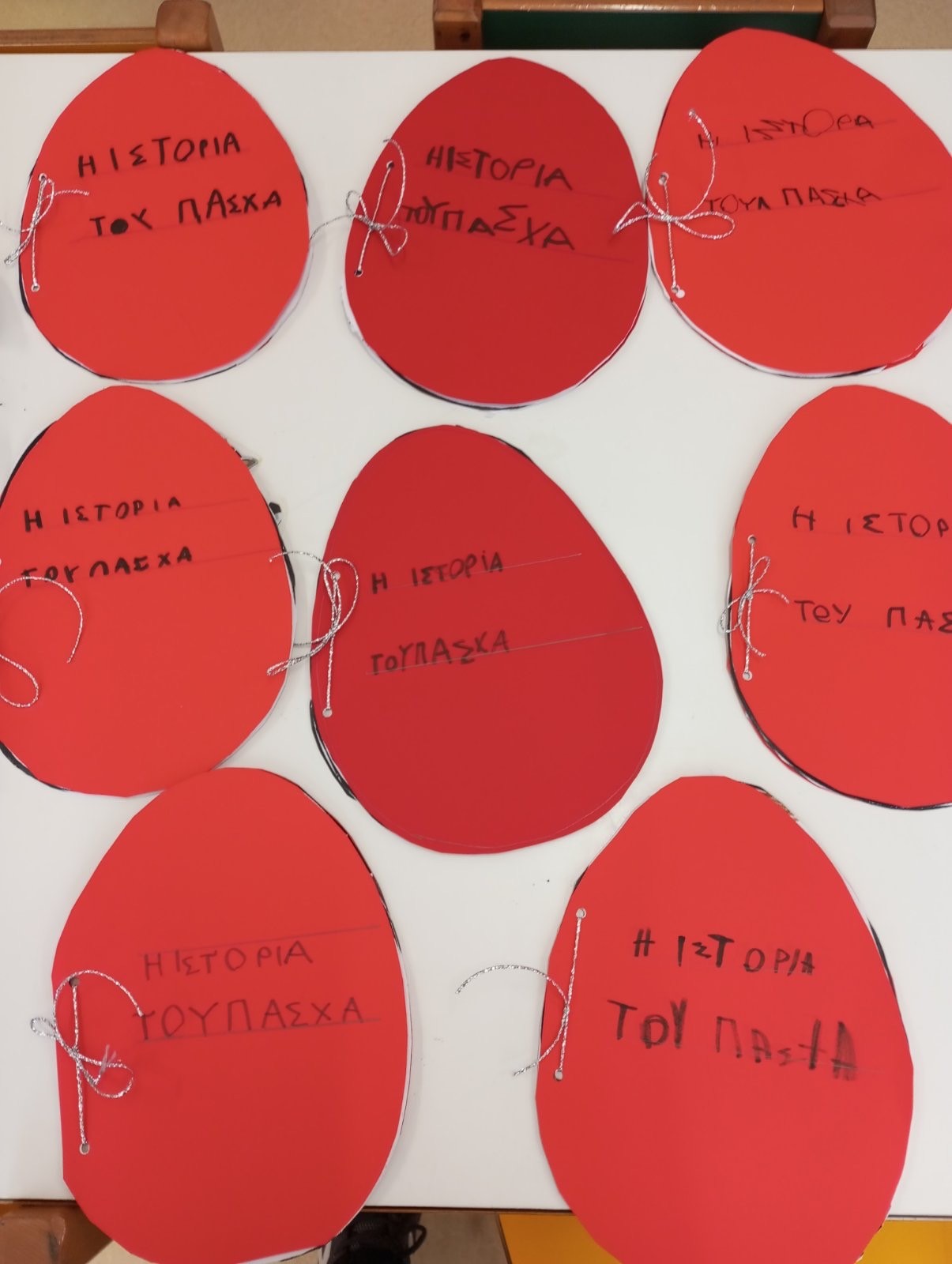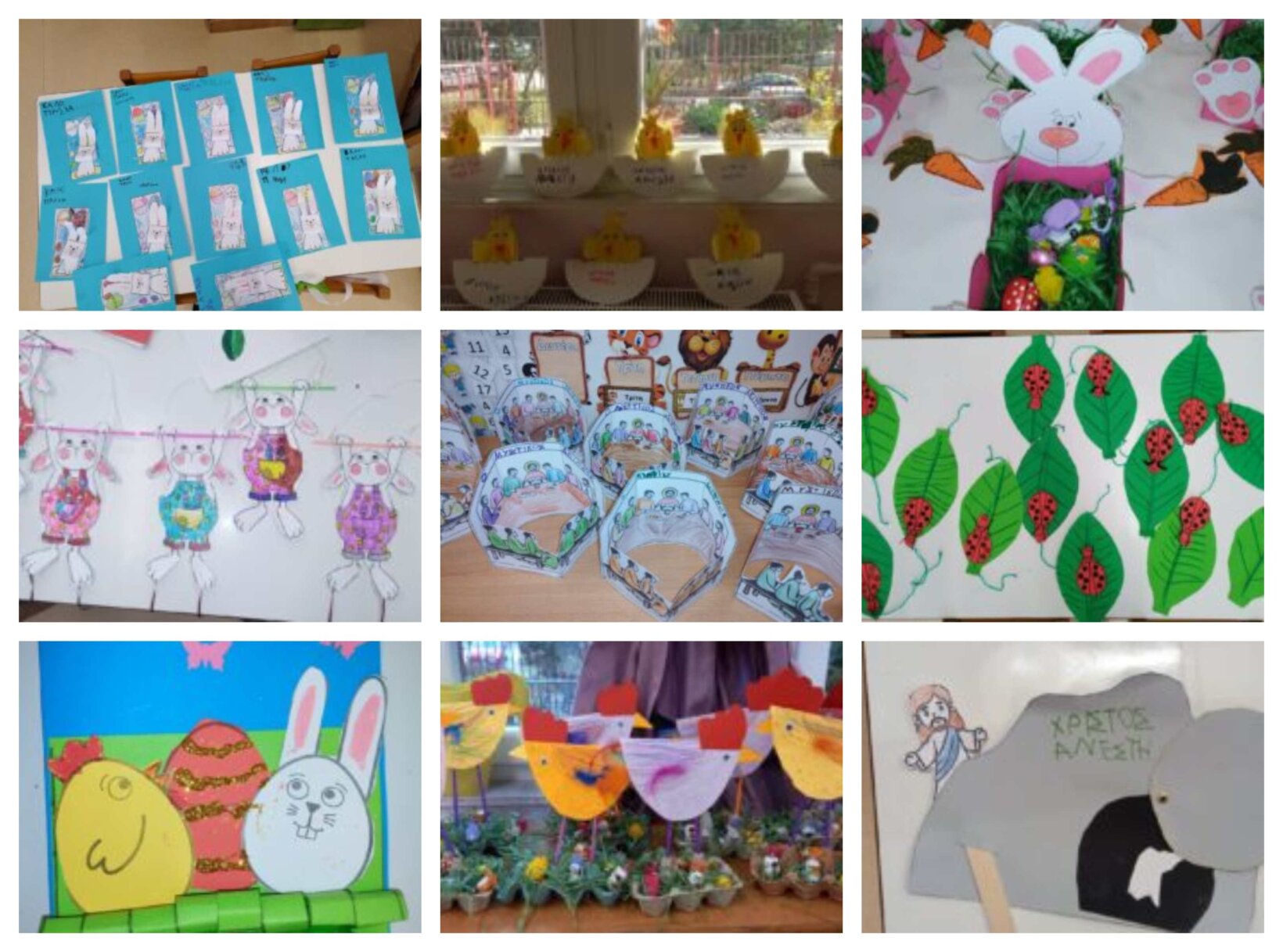Πλησιάζει το Πάσχα. Πρώτα απ’ όλα μιλήσαμε για τα πάθη του Χριστού και την Ανάστασή του. Διαβάσαμε πασχαλινές ιστορίες και είδαμε σχετικά videos στο διαδίκτυο. Γνωρίσαμε πως γιορτάζετε το Πάσχα σε κάθε γωνιά της πατρίδας μας .Τα κάναμε όλα αυτό το Πάσχα! Ζωγραφίσαμε τα αυγά μας και τα βάψαμε. Τα τοποθετήσαμε στα καλαθάκια και στις αυγοθήκες που κατασκευάσαμε, φυσικά δεν έλειψαν και τα σοκολατένια αυγά. Φτιάξαμε κάρτες για να γράψουμε τις ευχές μας, κουνιστά κοτοπουλάκια, μόμπιλ διακοσμητικά, λαγούς με τυπώματα, το τάφο του Χριστού και την ανάστασή του.