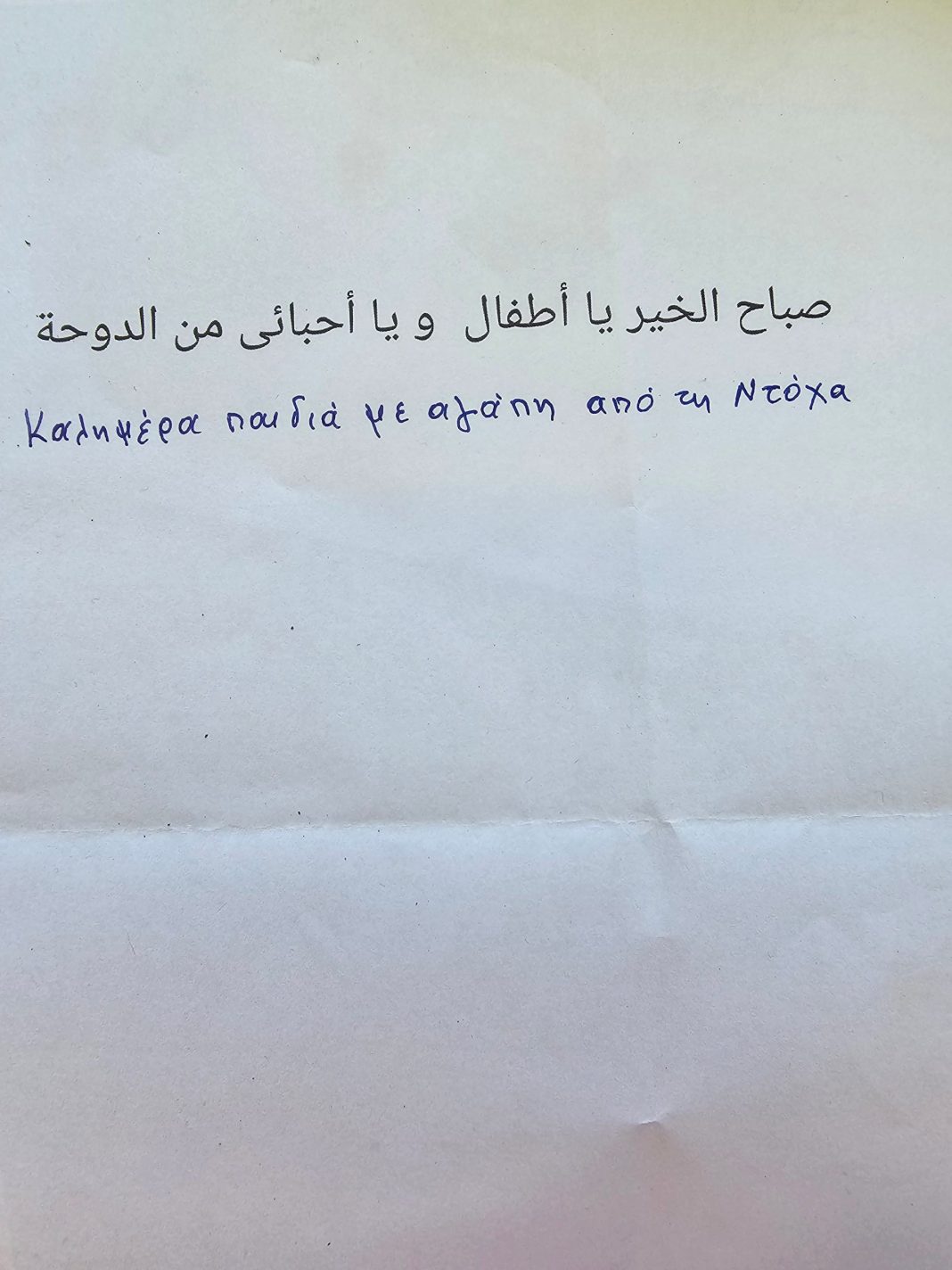 Θρανία ενωμένα, σκόρπιες χρωματιστές μπογιές, λευκά χαρτόνια και παιδιά γεμάτα λαχτάρα που με την ενθάρρυνση των εκπαιδευτικών έβαλαν όλη τους τη φαντασία για να ζωγραφίσουν κάτι σχετικό με τα παραμύθια και να γράψουν ένα γλυκό μήνυμα για τους μαθητές του ελληνικού σχολείου της Ντόχα, όπου θα πήγαινε η συγγραφέας .