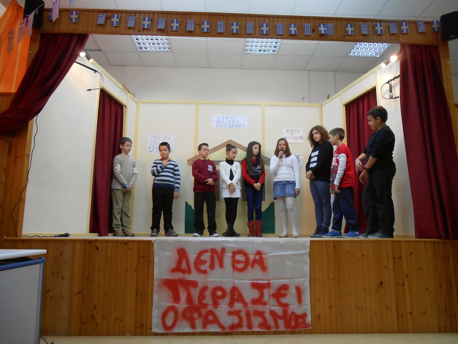 Μια πολύ όμορφη εκδήλωση παρουσίασαν οι μαθητές της Ε τάξης για την 41η επέτειο της εξέγερσης των φοιτητών του Πολυτεχνείου. Η γιορτή παρουσιάστηκε ανήμερα της επετείου, Δευτέρα 17 Νοέμβρη 2014, στην αίθουσα εκδηλώσεων του σχολείου μας. Οι μαθητές αναφέρθηκαν στο χρονικό της εξέγερσης, απήγγειλαν ποιήματα και παρουσίασαν μικρά θεατρικά δρώμενα για την ημέρα εκείνη.