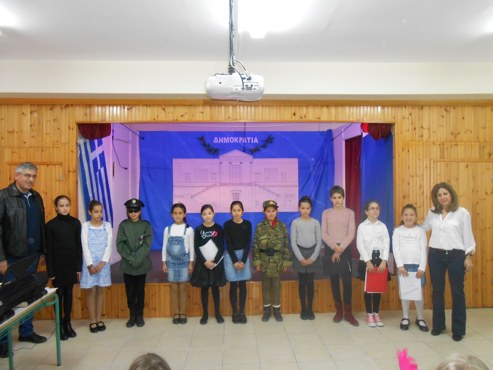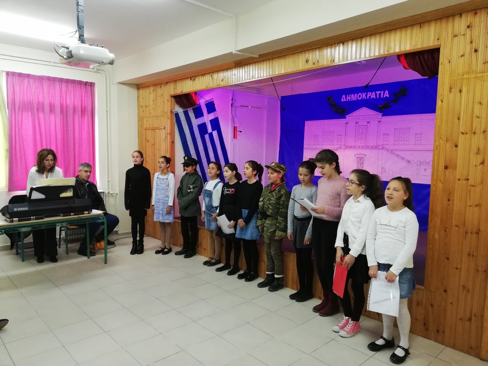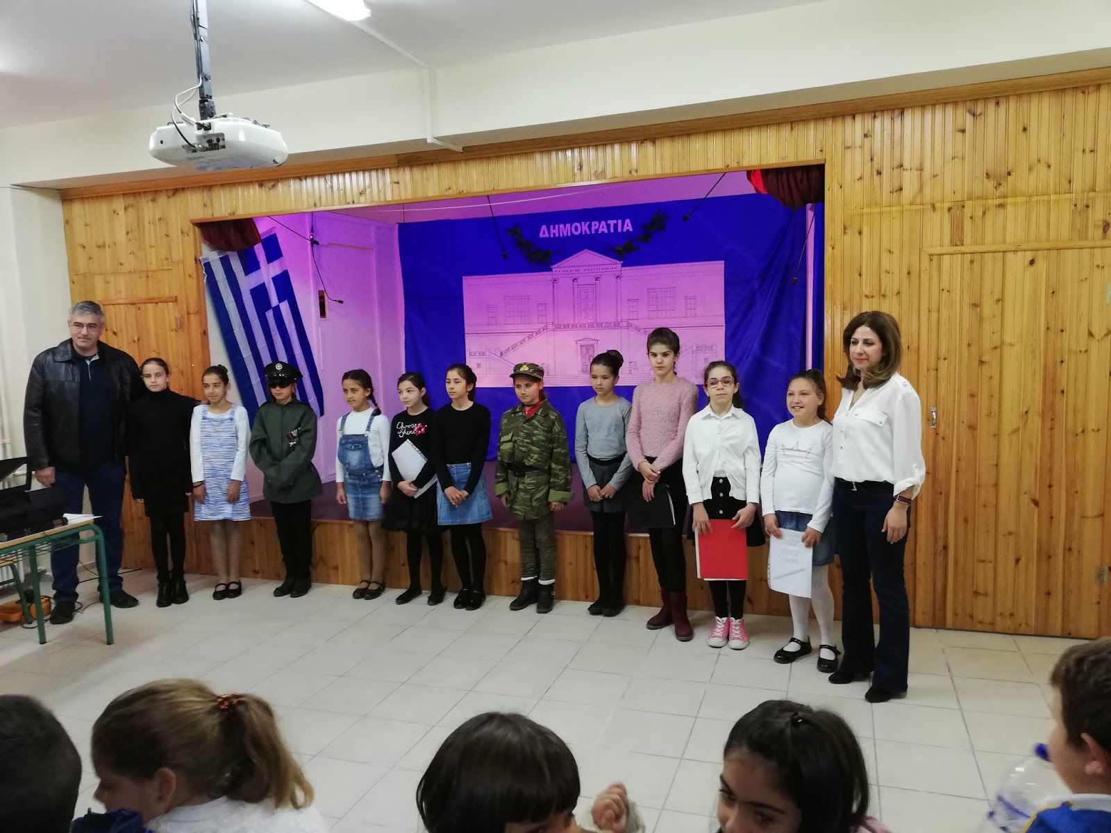 Συγχαρητήρια στους μαθητές/τριες, που συμμετείχαν στην εκδήλωση, στον υπεύθυνο δάσκαλο κ. Αθανάσιο Καραπόκη και στη δασκάλα των γαλλικών κ. Τόλκα Ελένη, η οποία συνόδευσε με το αρμόνιο τη χορωδία των μικρών μαθητών/τριών και μας ταξίδεψαν στο κλίμα εκείνων των ταραγμένων ημερών.