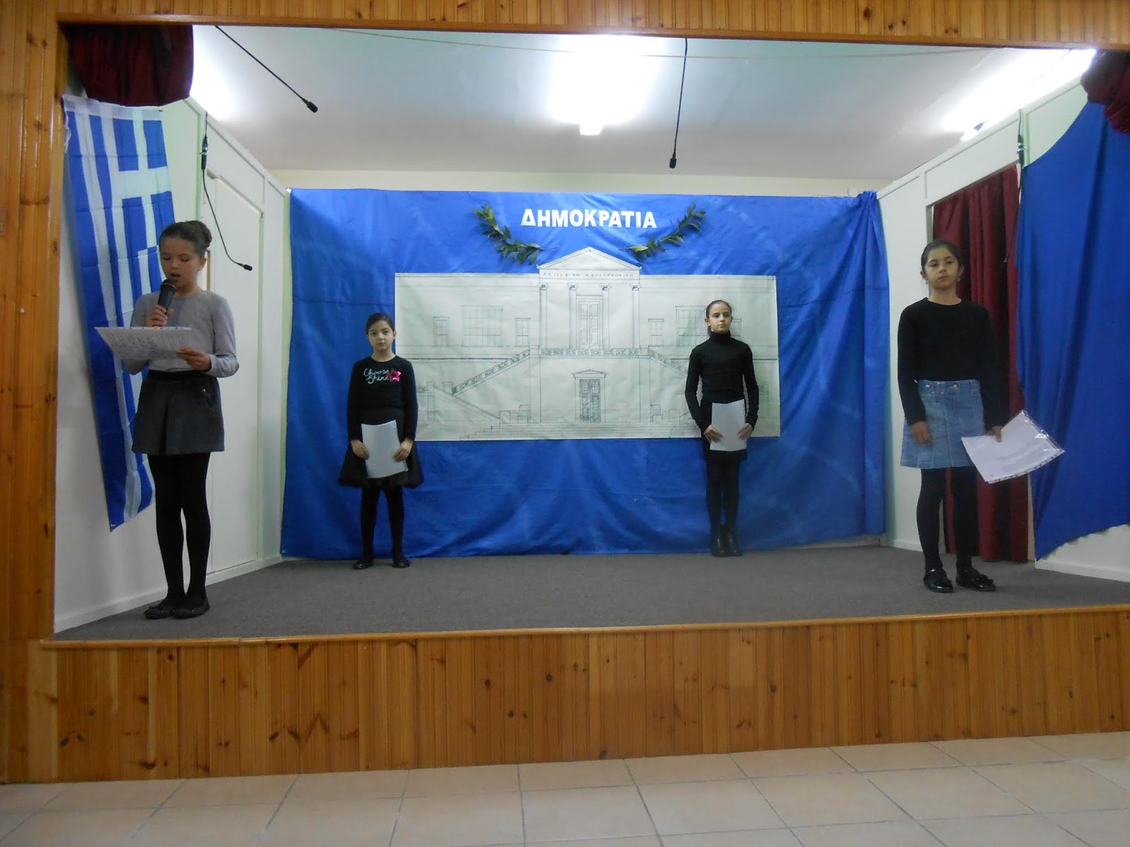 Συγχαρητήρια στις μαθήτριες, που συμμετείχαν στην εκδήλωση, στον υπεύθυνο δάσκαλο κ. Γεώργιο Παπαδόπουλο και στη δασκάλα των Γαλλικών κ. Τόλκα Ελένη, η οποία συνόδευσε με το αρμόνιο στα τραγούδια τη χορωδία των μικρών μαθητριών και μας ταξίδεψαν στο κλίμα εκείνων των ταραγμένων ημερών.