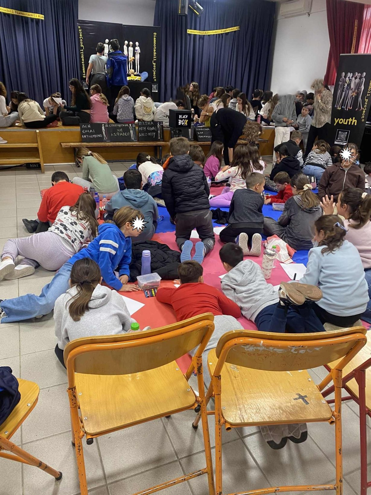 Oι μαθητές και οι μαθήτριες της Δ,Ε,και Στ τάξης χόρεψαν και κινήθηκαν στους ρυθμούς του “Ζορμπά”, του γνωστού συρτάκι και στο τέλος όλα τα παιδιά μαζί με τους δασκάλους και τις δασκάλες τους, τραγούδησαν την Ειρήνη !