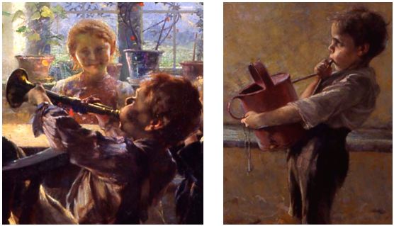 Το φως και τα χρώματα του πίνακα “περιλούζουν” έξι παιδικές μορφές και μία νεαρή κοπέλα, που πιθανόν είναι η μητέρα του μικρότερου ή ίσως και όλων τους. Τα τέσσερα αγόρια παίζουν ξυπόλυτα μουσική, δίνουν δηλαδή συναυλία. Ο πρώτος καθιστός σε ξύλινη καρέκλα παίζει τύμπανο, ο δεύτερος φυσάει δυνατά τη σάλπιγγα, ο τρίτος κάθεται σε ξύλινο πάγκο και φαίνεται να παίζει μάλλον φυσαρμόνικα…και τέλος, υπάρχει ένας τέταρτος “μουσικός” που στέκεται λίγο παράμερα και φυσάει με δύναμη όχι αληθινό όργανο, αλλά ένα ποτιστήρι. Οι ακροατές της παιδικής συναυλίας είναι γυναίκες, είναι δηλαδή ακροάτριες. Ένα όμορφο ξανθό κοριτσάκι κάθεται μπροστά στο κεντρικό παράθυρο και ακούει, η νεαρή μητέρα ακούει επίσης καθιστή μπροστά στο αριστερό παράθυρο, κρατώντας το μικρότερο κοριτσάκι που φοράει ένα ροδί φόρεμα και απλώνει χαρούμενο τα χέρια του προς τους μουσικούς.