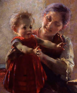 Μία εικόνα οικογενειακής θαλπωρής και χαράς. Η εικόνα αποτυπώνει με χάρη, τρυφερότητα και χιούμορ μία σκηνή του καθημερινού οικογενειακού βίου απλών ανθρώπων.