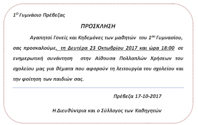 Όλοι μαζί, μαθητές και καθηγητές και γονείς ας ξεκινήσουμε αυτό το ταξίδι, αυτή την κοινή προσπάθεια ώστε και ο καθένας από εσάς να πετύχει τον προσωπικό του στόχο και το 1ο Γυμνάσιο Πρέβεζας αυτή τη σχολική χρονιά να απασχολεί δημιουργικά την τοπική κοινωνία με τη δράση του και τα κατορθώματα του!